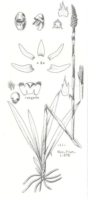 Found in Peru, Bolivia and northwestern Argentina at elevations around 2700 to 3800 meters as a medium sized, cold growing terrestrial with rosulate, cuneate-ligulate leaves arising on a separate shoot, that blooms in the summer on a more or less slender, 9.2 to 20.4" [23 to 51 cm] long, almost entirely enveloped by tubular-cylindric, imbricating, membraneous, acute sheaths stem, rachis 3.5 to 3.6" [7 to 9 cm] cylindric, densely many flowered inflorescence with triangular-ovate, shorter than the flower floral bracts.