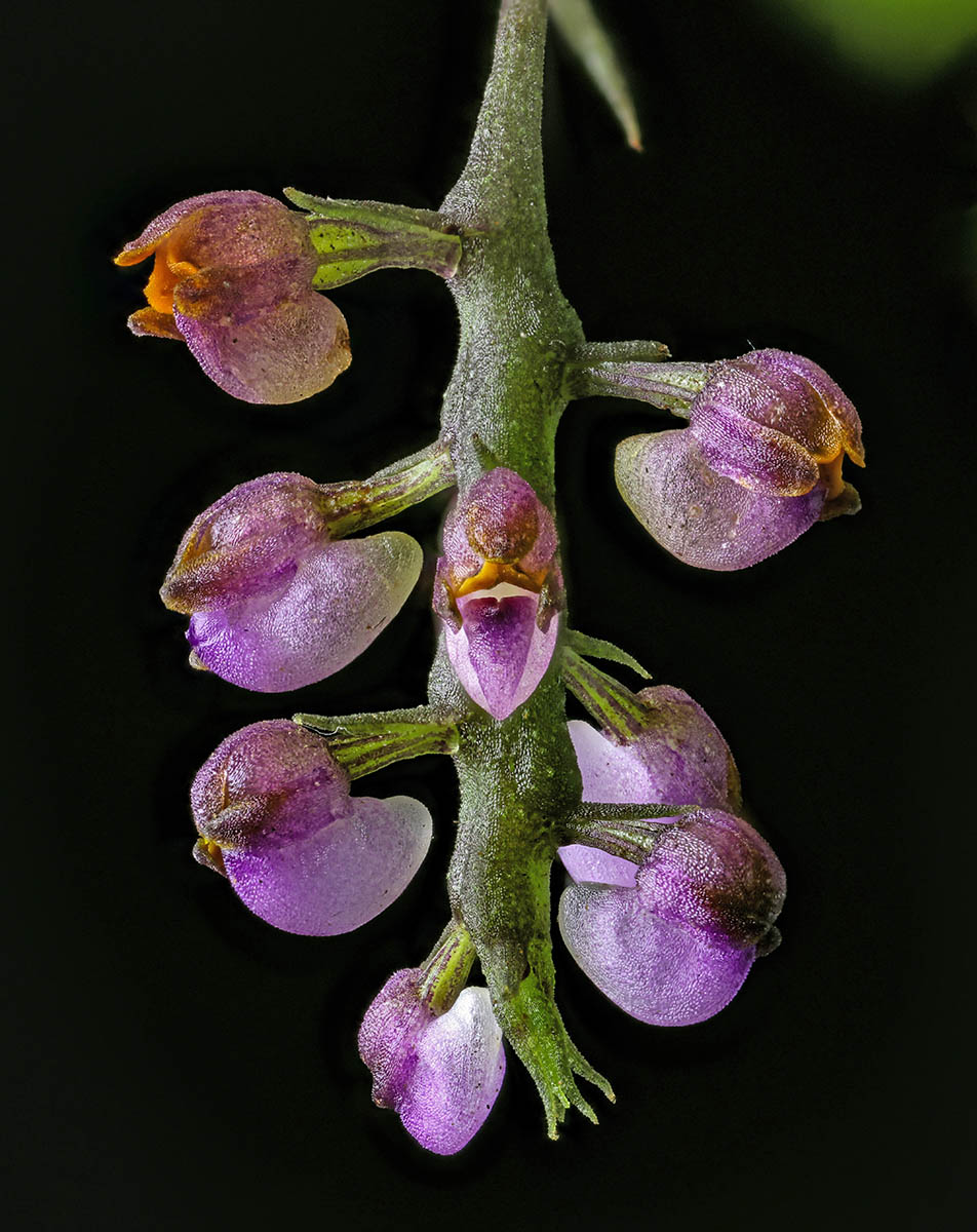 Found in the Philippines on Mindanao Island in cloud forests on mossy trees at elevations around 1600 meters as a mini-miniature sized, cool growing epiphyte with an erect to pendent stem carrying 3 to 4, lanceolate, oblong-elliptic, thin, spreading, flattened, entirely glabbrous, margins entire, 3 veined on each side of the leaf, midvein adaxially depressed and abaxially raised, unequally bilobed, sessile bsae leaves that blooms in the winter on a short, axillary, pendent, branching, peduncle, short, terete, slender, glabrous, dark green, swollen in the upper portion, 1.4" [3.5 cm] long, rachis emerging from the base of the stem sheaths, entirely glabrous, 2" [5 cm] long, to 15 flowered inflorescence with lanceolate, persistent, glabrous bracts and carrying small, membraneous, fleshy, minutely papillose, not opening widely flowers