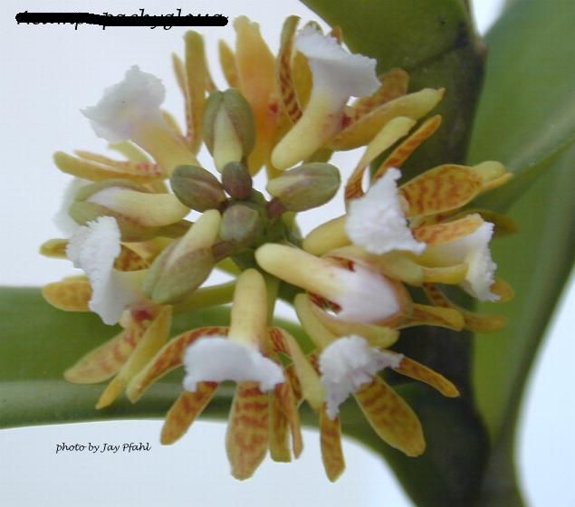 Found in the eastern Himalayas, Bangladesh, India, Nepal, Sri Lanka, Myanmar and Yunnan and Hainan provinces of China as a large sized, monopodial, clump-forming, hot to cool growing epiphyte in semi-deciduous and deciduous dry lowland forests at elevations of sealevel [600] to 1600 meters that should be treated as the genus Vanda culturally and has a stout, erect to curved stem carrying lorate, narrowly oblong, thickly coriceous, keeled, obliquely truncate, slightly notched into 2 unequal lobes, submucronate apically leaves that will bloom in the fall on a short, 1" [2.5 cm] long, many [10 to 12] flowered umbel with miniature fragrant hyacynth scented flowers held close in to the leaf axils, if given partial sun and warm temperatures with regular year round watering and feedings.