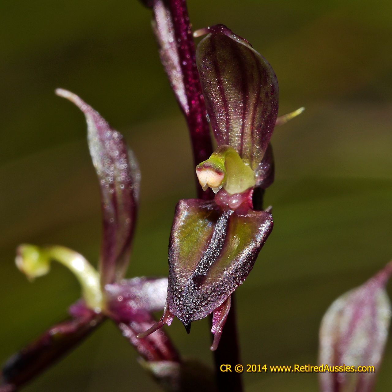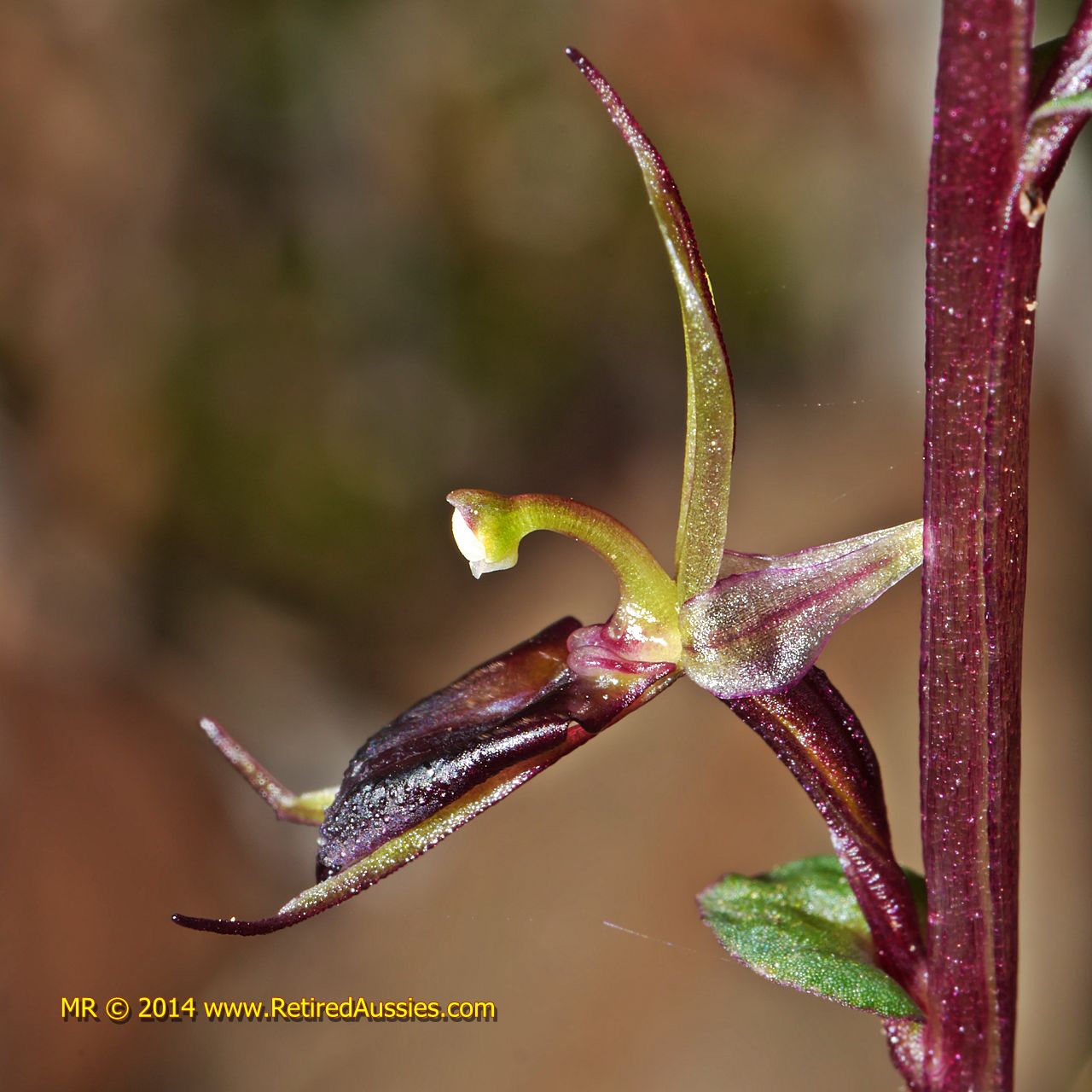 Found in New South Wales and Victoria Australia in moist to wet eucalypt forest, sheltered slopes and gullies at elevations of seea level to 800 meters as a miniature sized, cool to cold growing terrestrial orchid with a low to the ground, heart-shaped, green above, purple below, leaf and an erect, several flowered, 2 1/2" [5.5 cm] long, racemose inflorescence that occurs in the fall and winter in situ. The flowers are said to be pollinated by small flies.