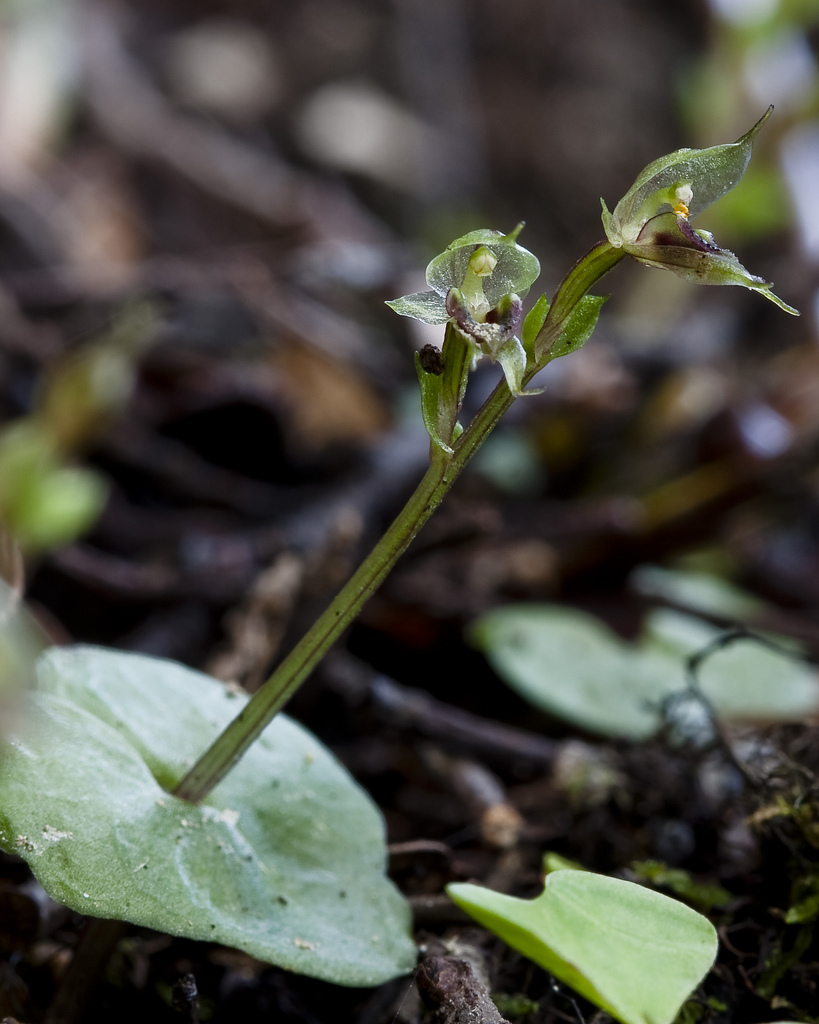 Found in New Zealand including Stewart Island, Chatman Island and Kermadec Island in damp lowland forests and tracksides as a mini-miniature sized, cool growing terrestrial with a slender, hairless, squarish stem carrying a cordate, dark green, infused with purple, half way up the stem leaf that blooms in the fall and winter on an erect, 1 to 10 flowered inflorescence with triangular, acute, inflated floral bracts.