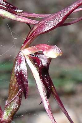 Synonyms Acianthus caudatus var. ater Lindl.1940; Acianthus caudatus var. pallidus Rupp 1947; Epipactis caudata (R.Br.) Poir. 1812; Nemacianthus caudatus ( R.Br. ) D.L.Jones & M.A.Clem. 2002