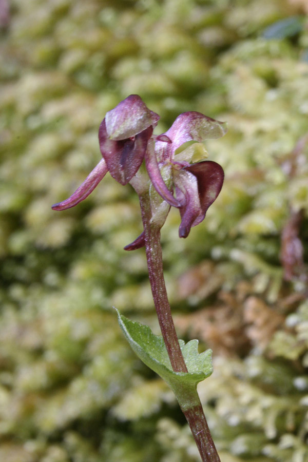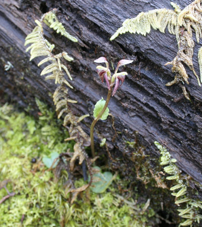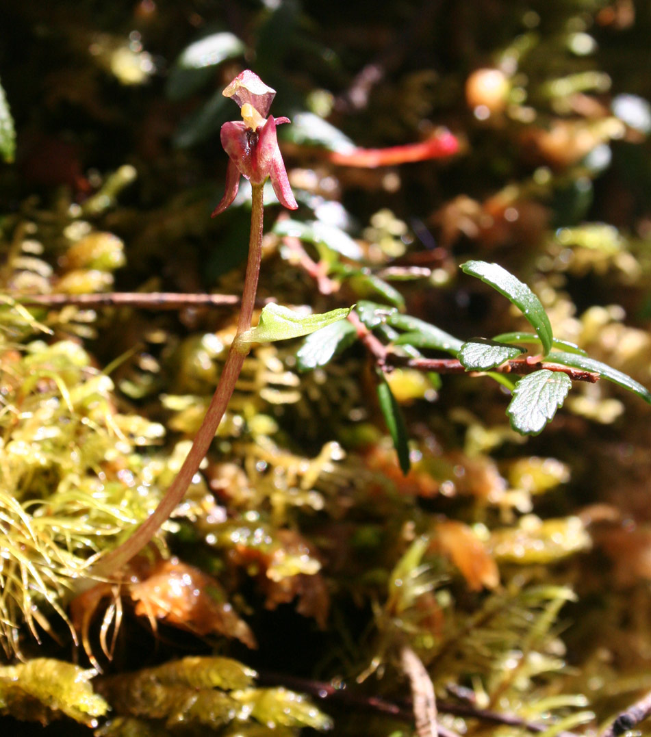 Found in Tasmania and New Zealand at elevations of 100 to 1000 meters in permanently wet forests in thick moss as a miniature sized, cold growing terrestrial with erect, pale green to yellowish, thin-textured, crin=kled margined, petiolate base leaves that blooms in the late spring and early summer on an erect, 2 to 6" [5 to 15 cm] long, fleshy, brittle, 1 to 4 flowered inflorescence carrying horizontal to nodding flowers