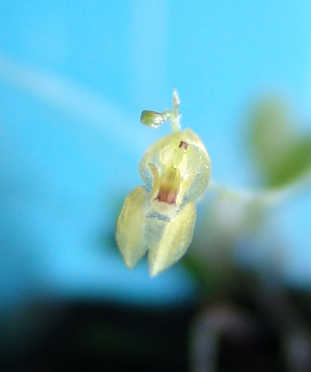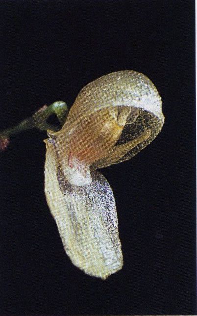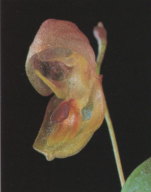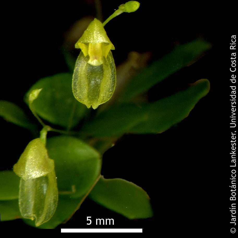 Found in Ecuador, Colombia, Panama and Costa Rica at 100 to 1000 meters in elevation on mossy limbs in cool, moist tropical forests with orange and guava trees as a miniature sized, hot to warm growing caespitose epiphyte with a short ramicaul enveloped basally by 2 to 3 tubular sheaths and carrying a single, apical, elliptic, obtuse, gradually narrowing below into the conduplicate, petiolate base lead where they can flower at any time of the year on an erect to suberect, to 1.8" [4.5 cm] long, successively few [3 to 8] flowered, fractiflex scape with a single flower at a time held well above the leaves.