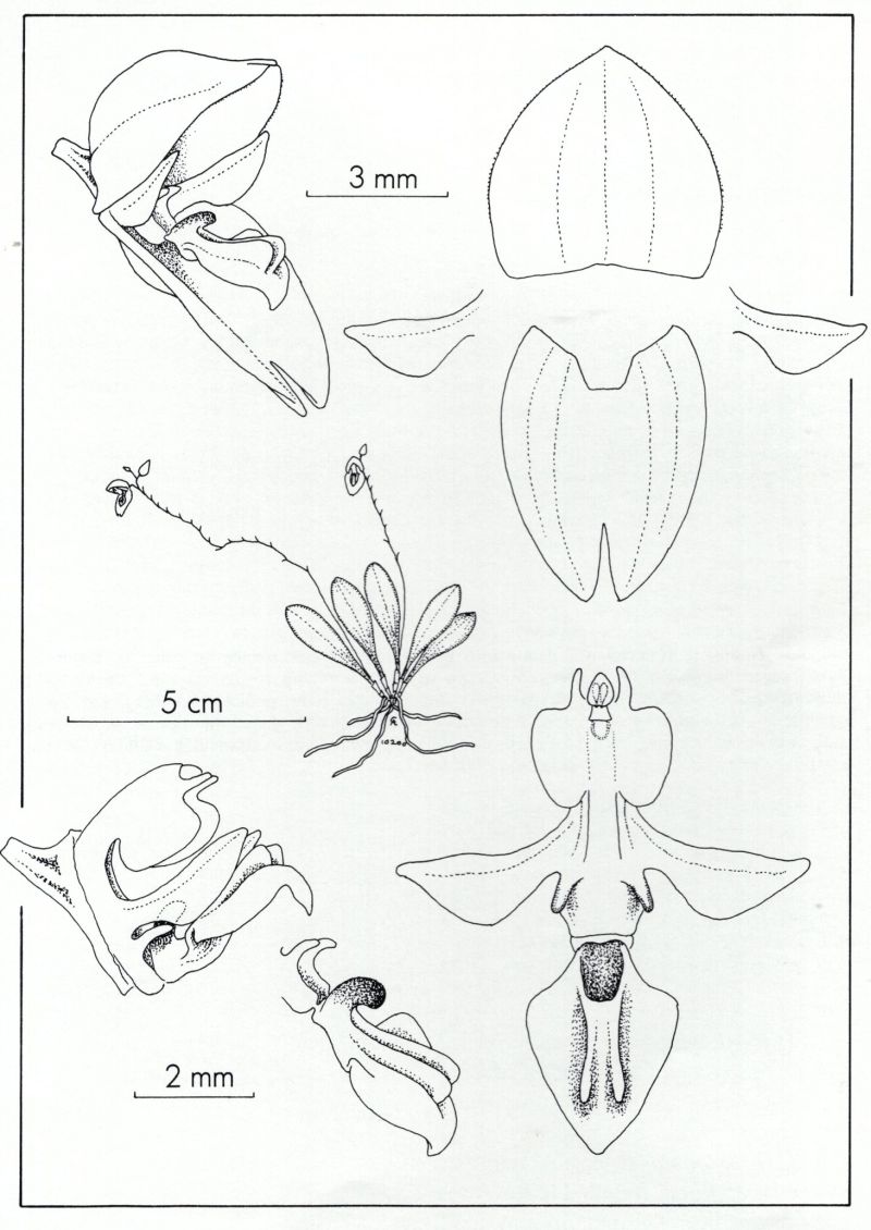 Found in Colombia in rainforests at elevations around 2550 to 2840 meters as a mini-miniature sized, cold growing epiphyte with ascending to erect, slender ramicauls enveloped basally by 2 to 3 thin, tubular sheaths and carrying a single, apical, erect, coriaceous, elliptical or narrowly elliptical to narrowly obovate, subacute to obtuse, cuneate below into the petiolate base leaf that blooms in the fall on an erect, to suberect, loose, successively many [to 16] flowered, racemose, to 2.2" [to 5.5 cm] long, slender inflorescence with thin floral bracts.