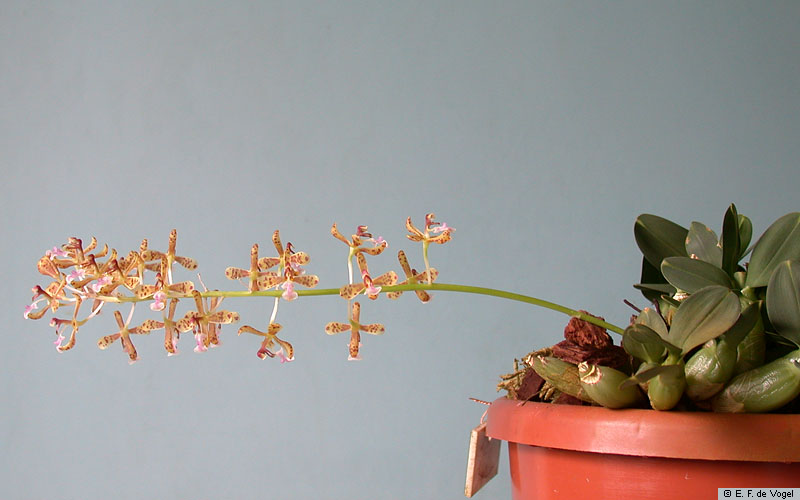 Found in the Borneo, Malaysia and Sumatra in lowland forests as a miniature sized, hot to warm growing epiphyte with ovoid, laterally rugose pseudobulbs carrying 2, apical, obtuse apically, gradually narrowing below into the petiolate bnase leaves that blooms on a basal, 4.8" [12 cm] long, simple inflorescence with close set flowers
