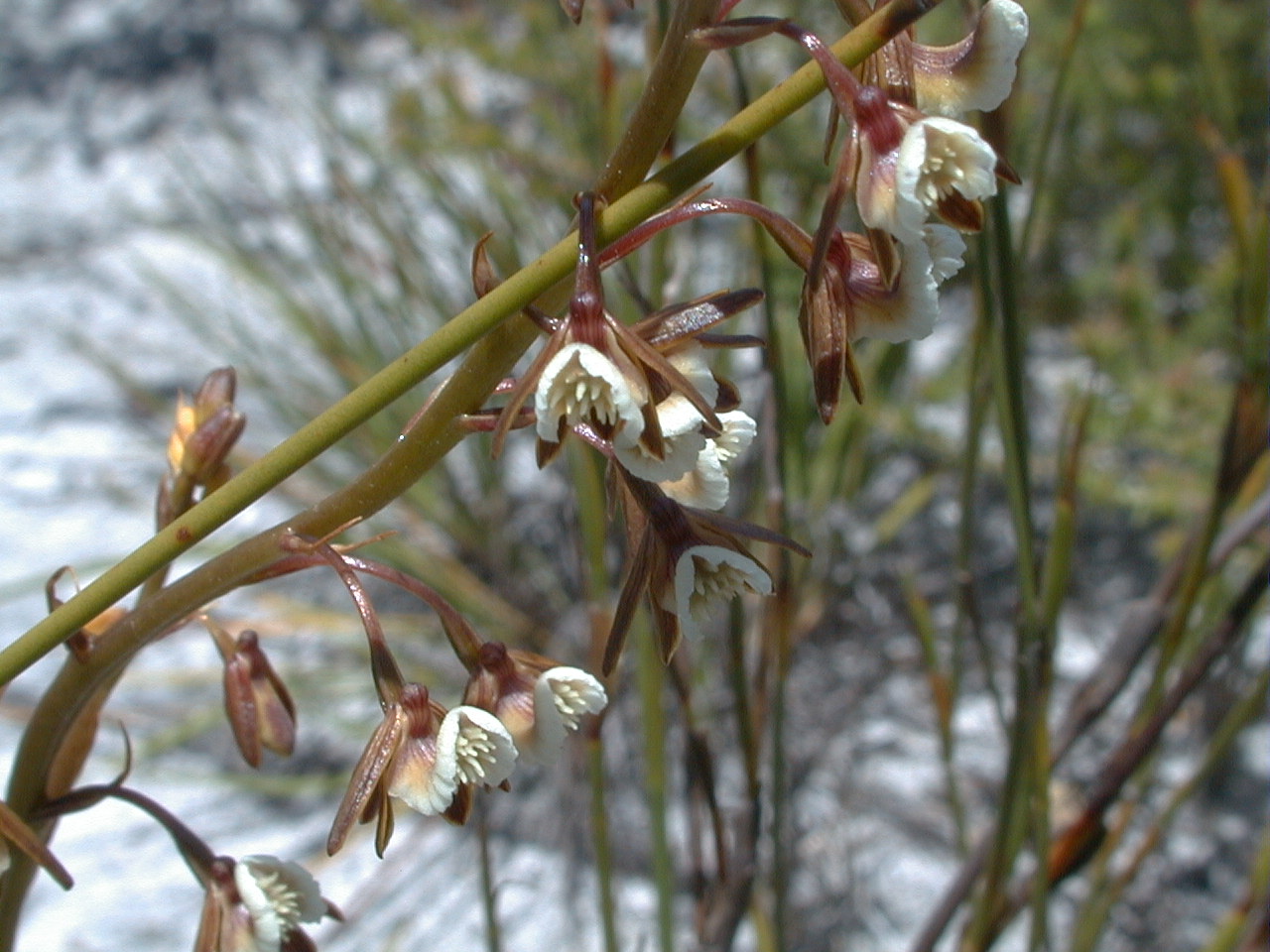 Found in southwestern Cape Province in restio-veld in sand at elevations near sea level to 250 meters as a slender to robust, medium to just large sized, cold growing terrestrial with imbricate, conduplicate, linear, acute, coriaceous, grading above into tnarrowly lanceolate, papaery leaves that blooms in the spring to early summer on an erect, laxly branched,to 12" [30 cm] long, many flowered inflorescence with half as long as the pedicel floral bracts and carrying non-resupinate flowers