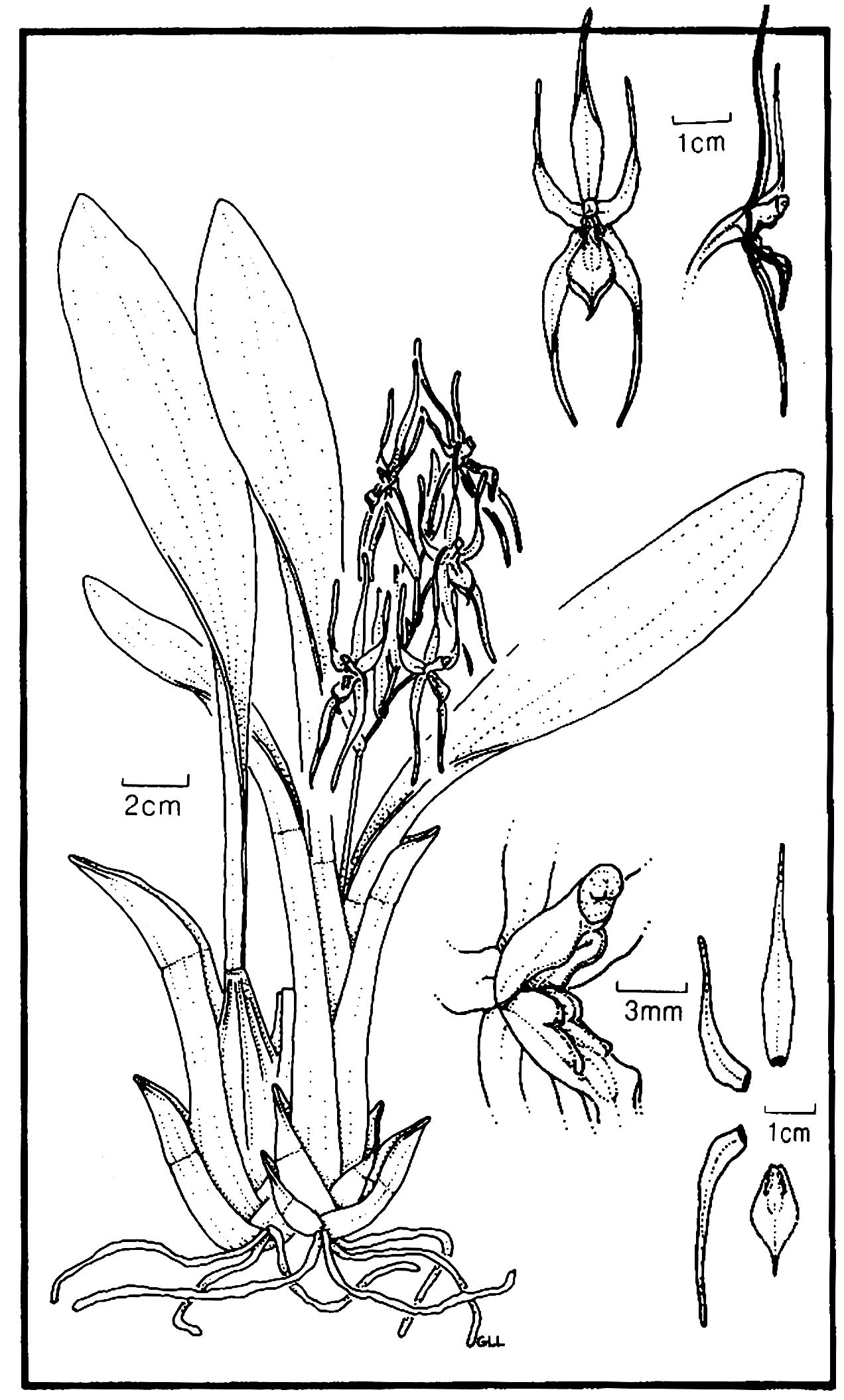 Found in Loja province of Ecuador at elevations around 2250 meters as a small to medium sized, cold growing epiphyte with ovate, compressed pseudobulbs enveloped completely by 3 to 5 foliaceous sheaths carrying carrying obovate, obtuse, narrowing below intot he subpetiolate, conduplicate base leaves that blooms in the summer on an axillary, stiffly erect, to [18 cm] long, with 1 to 3 loose, basal sheaths, 7 to 9 flowered inflorescence and carrying fragrant flowers that smell of vanilla.