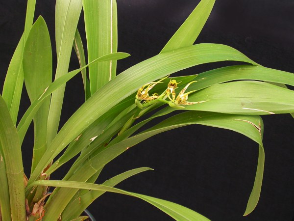 Found in Venezuela, Colombia, Ecuador, Peru and Bolivia in wet montane forests at elevations of 1000 to 2850 meters as a medium sized, warm to cold growing epiphyte or terrrestrial on steep embankments with small pseudobulbs enveloped completely by 5 to 7, imbricating leaf bearing sheaths and carrying a single, apical, narrowly elliptic, acute, conduplicate below into the elongate, petiole-like base leaf that blooms throughout the year on an axillary, erect, 11" [27 cm] long, densly several [8 to 10] flowered, racemose inflorescence arising on a mature psedobulb with simultaneously opening flowers.