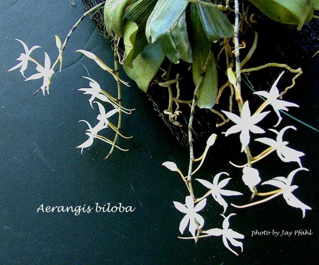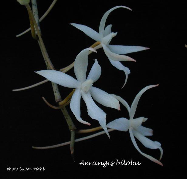 Synonyms Aerangis campyloplectron (Rchb.f.) Garay 1972 ; Angorchis biloba (Lindl.) Kuntze 1891; Angorchis campyloplectron (Rchb.f.) Kuntze 1891 ; Angraecum apiculatum Hooker 1845; *Angraecum bilobum Lindley 1840; Angraecum campyloplectron Rchb.f. 1855; Rhaphidorhynchus bilobus (Lindl.) Finet 1907
