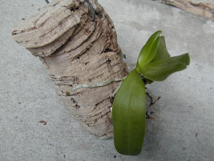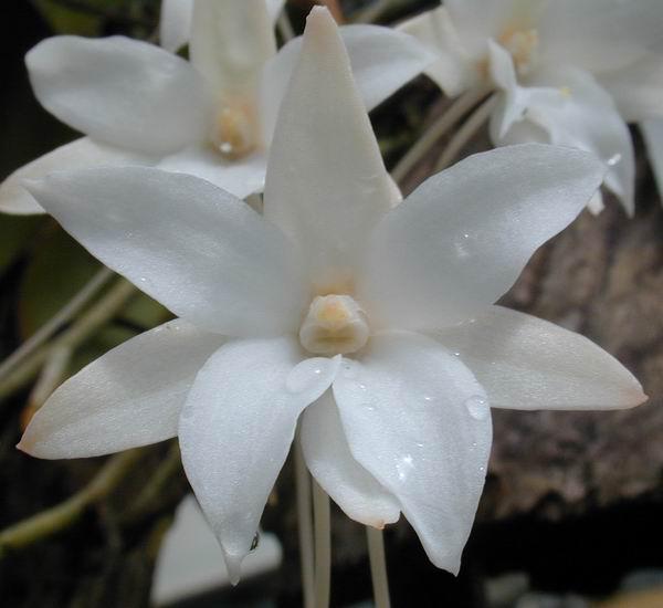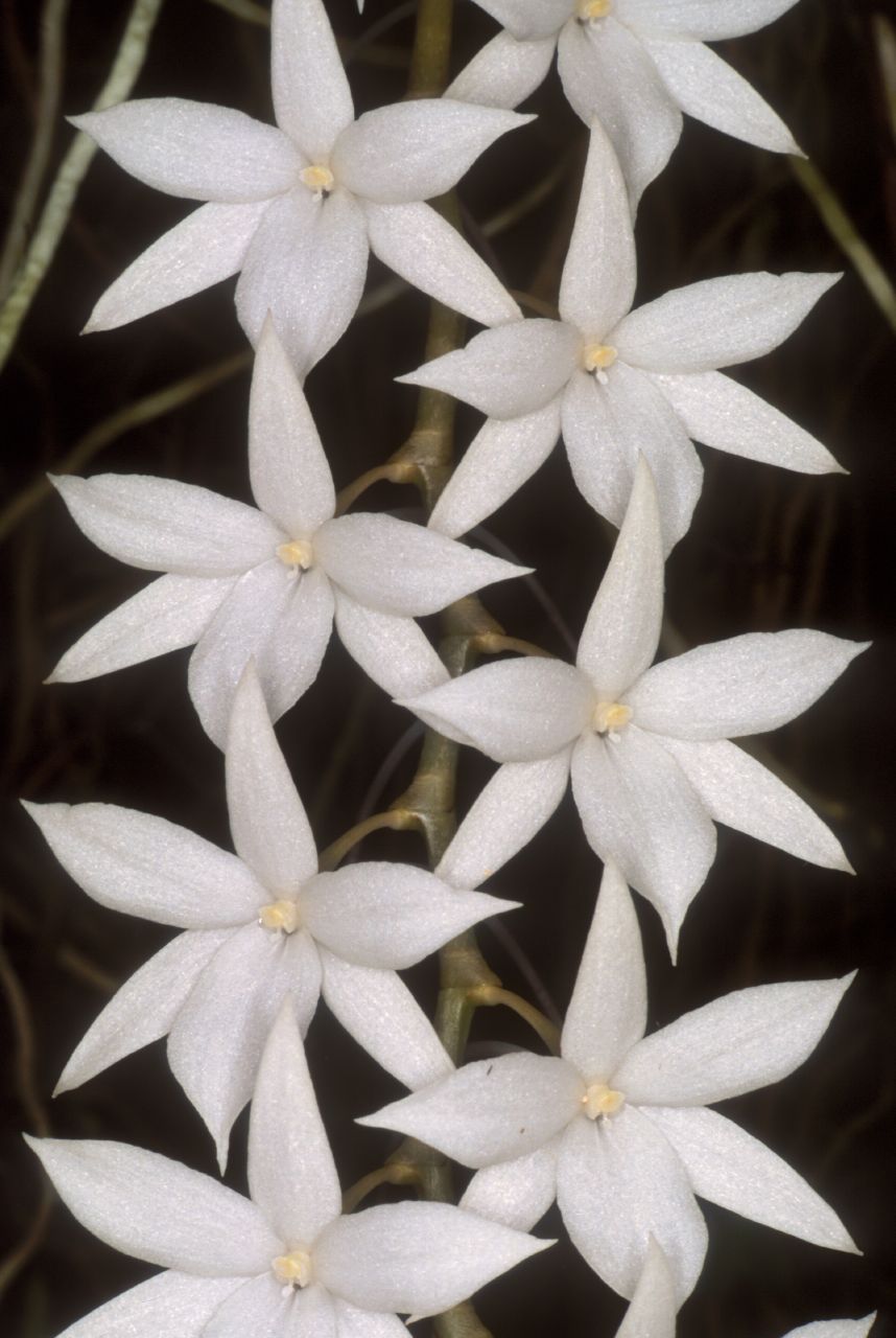 A small sized, Madagascan and Comoran species that occurs at altitudes of 100 to 1700 meters as an hot to cool growing epiphyte with 6" [15 cm] or shorter stems carrying obovate, fleshy-coriaceous, bilobed apically leaves and blooms in the spring to early summer on a to 20" [50 cm] long, pendant inflorescence with 6 to 15 well spaced, waxy, fragrant minty scented, long-lived flowers, often with the apical flower opening first and being the largest .