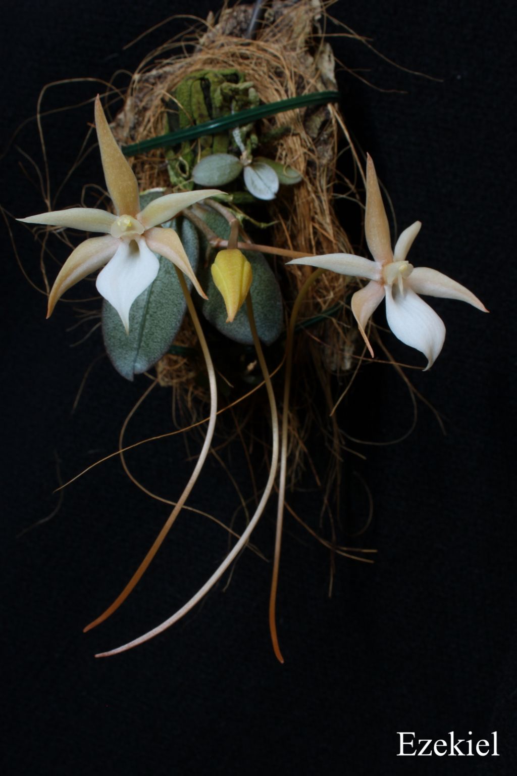 Found in Madagascar in the central highlands as well as Reunion on shrubs and trees in highland forests at elevations of 900 to 1500 meters as a mini-mini plant [less than 1 1/2" total], warm to cool growing epiphyte grey green, flattened, verrucose roots and grayish green, spotted silver, elliptic or oblong leaves that are acutely bilobed apically, comes from and blooms in the spring and summer on a short inflorescence with a solitary to 3 - 4" flowers.