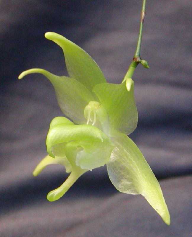 Found in south central Madagascar and Reunion in humid, evergreen, montane forests at elevations of 400 to 1500 meters as a small sized, warm to cool growing epiphyte with a short stem carrying 3 to 8, linear, v-shaped in cross-section leaves that blooms in the late spring, summer and winter on n erect to ascending, simple to 2 branched, rigid, to 8" [to 20 cm] long inflorescence enveloped by pale bracts.