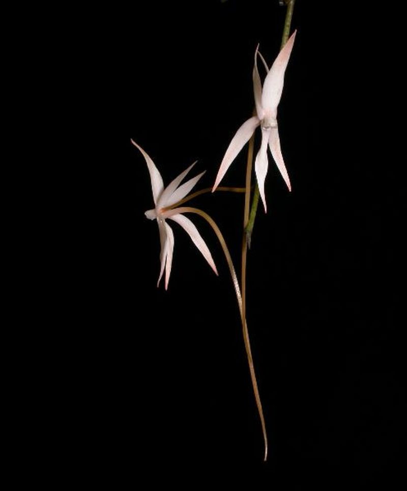 Found in Ghana, Congo, Equatorial Guinea, Gabona and Zaire in evergreen forests or on old citrus trees below elevations of 400 to 1000 meters with 4 to 6, oblanceolate to obovate, rather light green, unequally and obtusely bilobed apically leaves borne in a fan-shape that blooms in the spring on apendant, very slender, to 24" [60 cm] long, fractiflex rhachis, 3 to 8 flowered inflorescence .