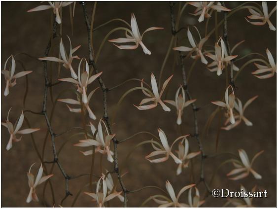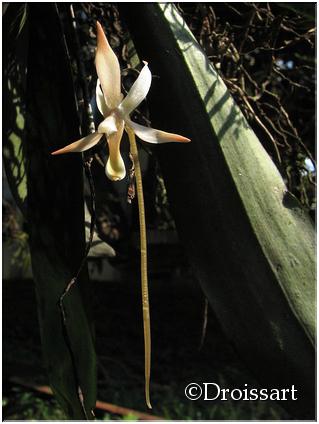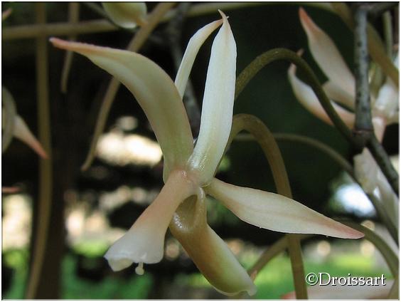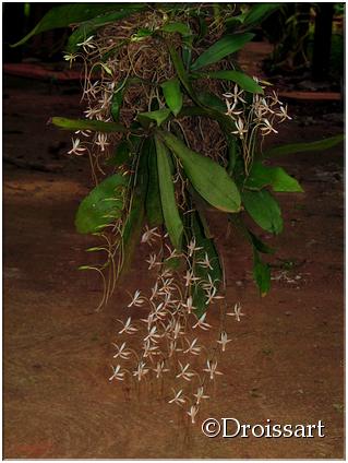 Found in Cameroon, Gabon, Zaire, Central African Republic, Uganda, Tanzania and Zambia in disturbed moist woodlands, rainforests and neglected plantations at elevations of 800 to 1200 meters as a small sized, warm growing epiphyte with a woody stem carrying 4 to 7, distichous, oblanceolate, slightly oblique to falcate, unequally bilobed apically, fleshy, dark green, dotted black to dark brown leaves that blooms in the spring on an axillary or below the leaves, erect, horizontal or pendant, terete, racemose, fractiflex, greyish green dotted with brown, 1.6 to 3.2" [4 to 8 cm] long, 4 to 16 flowered inflorescence with 2 to 3, black dotted, tight lower bracts and spreading, triangular, subacute to obtuse upper bracts and carrying nocturnally fragrant flowers.