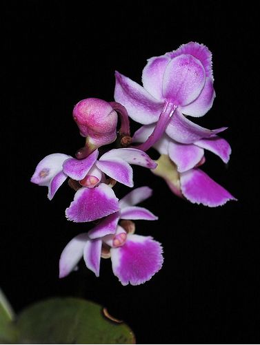 Found in southwestern India in semi-evergreen forests at elevations of 700 to 1300 meters as a large sized, warm to cool growing epiphyte with a thick dull violet purple stem carrying spreading, thick, coriaceous, pale green with dull-violet -purple basally, unequally bilobed apically with a small mucro between the lobes, strap-shaped leaves that blooms in the spring through fallon an axillary, 16 to 20" [40 to 50 cm] long, erect to arching, branched, 20 to 25 flowered inflorescence carrying fragrant [pineapple or sassafrass] flowers