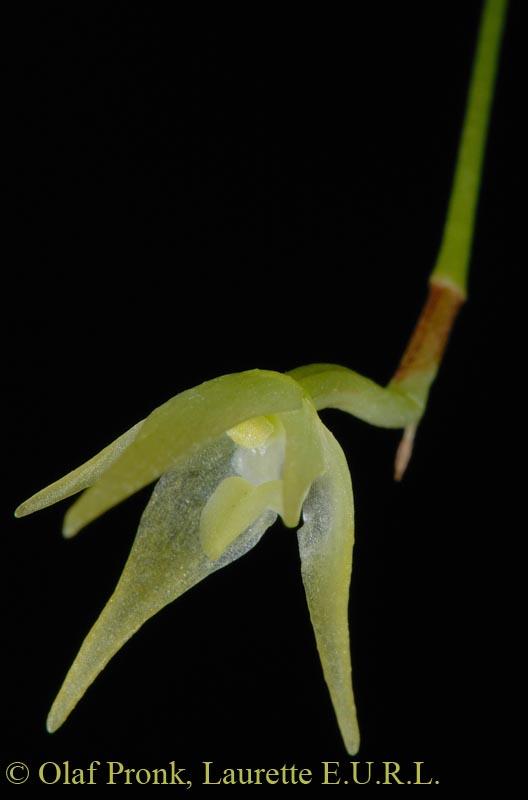 Found in central Madagascar at elevations around 800 to 1750 meters on moss and lichen covered tree trunks as a miniature sized, hot to cool growing epiphyte with a short stem carrying 4 to 6, linear, grass-like leaves that blooms in the late spring through early winter from the stem base, wiry, 1 to 3 flowered inflorescence with 3 to 4 small, distant bracts.