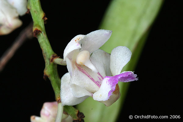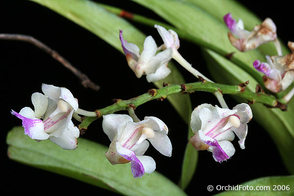 Found in the eastern Himalayas, Myanmar, Thailand, Laos, Cambodia, Yunnan province of China and Vietnam occuring in semi-deciduous and deciduous dry lowland forests at elevations of sealevel to 700 meters as a medium to large sized, hot to warm growing, monopodial epiphyte that has an erect stem carrying oblong-ligulate, rigid, thick, coriaceous, somewhat glaucous on top, streaked dark green with red beneath leaves and blooms on a 20" [50 cm] long, lossely or densly flowered, pendant inflorescence with a few to many [30] fragrant citrus scented, waxy flowers occuring in the spring and summer.