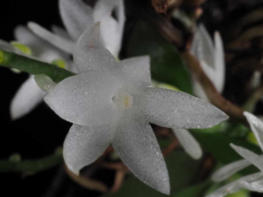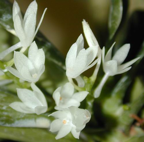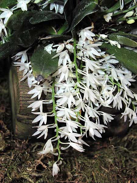 Found in Madagascar in shady locales in moss forests at elevations of sealevel to 1000 meters as a miniature hot to warm growing epiphyte with a very short stem carrying 2 to 8 closely set, elliptic, unequally bilobed apically, coriaceous, dark glossy green leaves with somewhat erect, racemose, 2 to 2 3/4" [5 to 7 cm] long, inflorecence carrying from 6 to 20 glistening white flowers occuring in the winter.