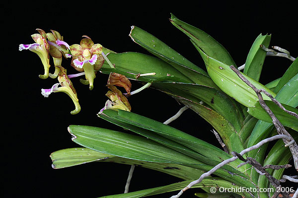 Found in Thailand, Myanmar and Yunnan province of China at lowland broad-leaved evergreen and semi-deciduous forests edges or sparse woods at elevations of 200 to 1700 meters as a small to just medium sized, hot to cool growing epiphytic species that requires partial sun and has a shorter stem carrying many, lorate, curved, keeled, bilobed apically leaves and blooms in the spring with a 4 to 10" [10 to 25 cm] long, pendant, lax, 3 to 15 flowered inflorescence carrying fragrant flowers.