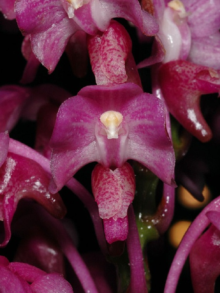Found in the Philippines at medium elevations as a small to just medium sized, monopodial, cool to hot growing epiphyte with curved stems carrying many, lorate, leathery, unequally bilobed apically leaves that blooms in the spring and fall with pendant, 16" to 46" [40 to 115 cm] long, densly many flowered inflorescence enveoloped by remote, tubular, ovate sheaths and ovate, acute, reflexed floral bracts carrying fragrant, waxy, long-lived flowers.