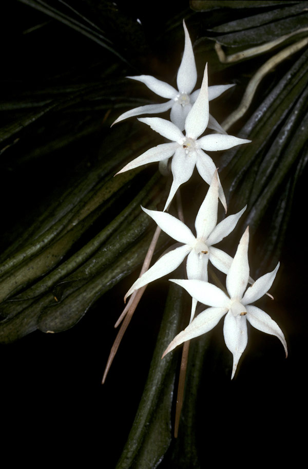 This species occurs in Ethiopia, Kenya, Tanzania, Mozambique and South African in coastal bush and riverine forests on shrubs and and small trees at elevations up to 450 meters as a small sized, hot growing epiphyte in deep shade and high humidity with a short stem carrying 2 to 7, dark green to gray green sometimes with a reddish tinge, narrowly oblanceolate, unequally bilobed apically, rounded to acute leaves that blooms in the fall on a spreading to pendant, to 7" [17 cm] long, 2 to 6 flowered inflorescence carrying apical flower first which is generally larger than the rest and the fragrant gardenia scented flowers are white strongly tinged with salmon