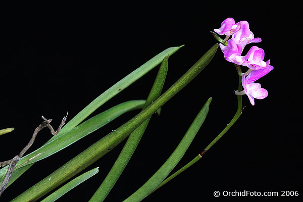 Found in penninsular Malaysia and penninsular Thailand on vertical limestone cliffs, as a small sized, hot to warm growing lithophyte with a monopodial stem carrying several thick, conduplicate leaves that blooms on an axillary, arcuate, 4 3/4" to 5 1/2" [12 to 14 cm] long [sometimes longer], several to many [12 to 15] flowered, mostly racemose inflorescence carrying simultaneously opening flowers.