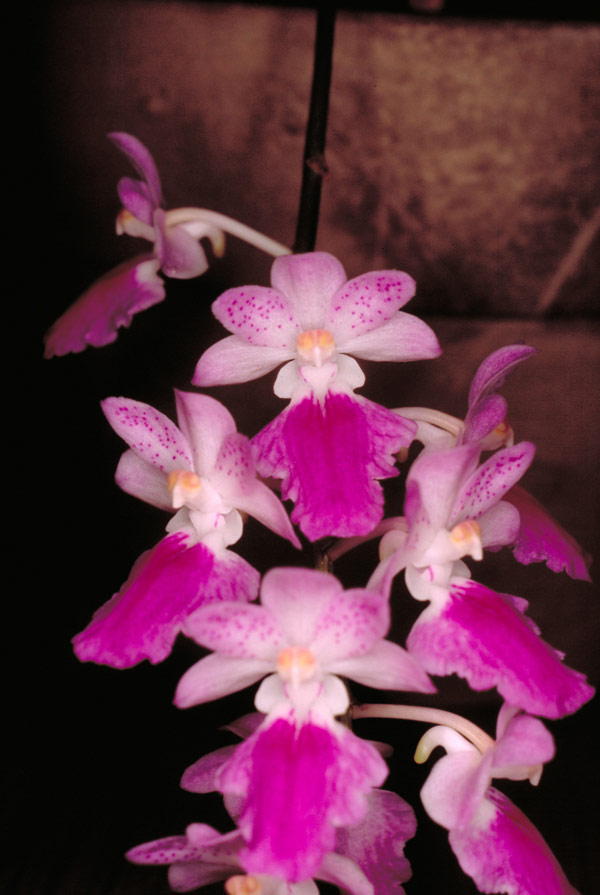 Found in India in moist deciduous, dry semi-evergreen forest as a medium to large sized, hot growing epiphyte with an erect stem carrying leathery, bilobed apically leaves that blooms in the spring and early summer on an axillary, horizontal to arching, usually branching basally, to 10" [25 cm] long, many flowered inflorescence with waxy, fragrant flowers