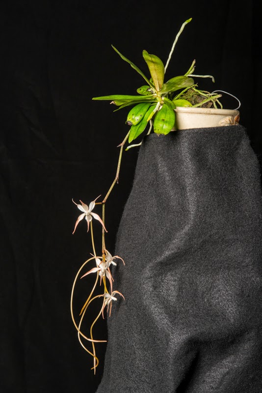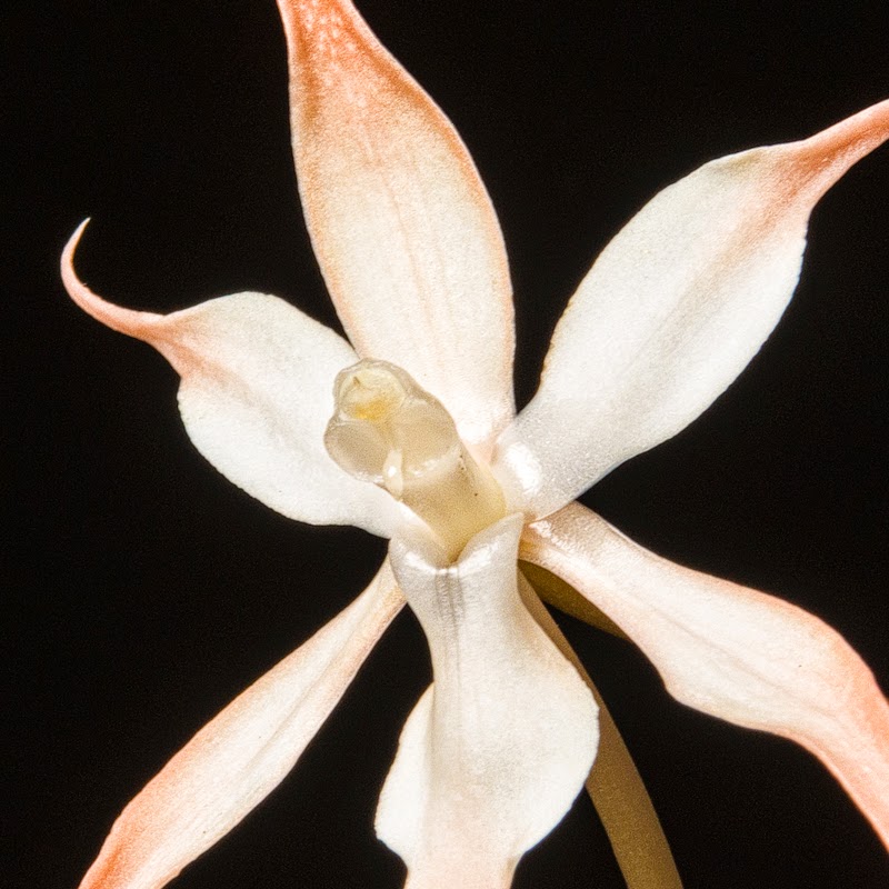 Found in Tanzania on tree trunks in forest remnants at eleavtions around 2000 meters as a small sized, cool to cold growing epiphyte with a short, woody stem carrying 5, arrangned in a fan, all in one plane, obovate, unequally bilobed apically, longer lobe acute, shorter subacute or absent all together leaves that blooms on a slightly zig-zag, to 6" [15 cm] long, 2 to 4 flowered inflorescence carrying large centrally white the rest salmon pink flowers