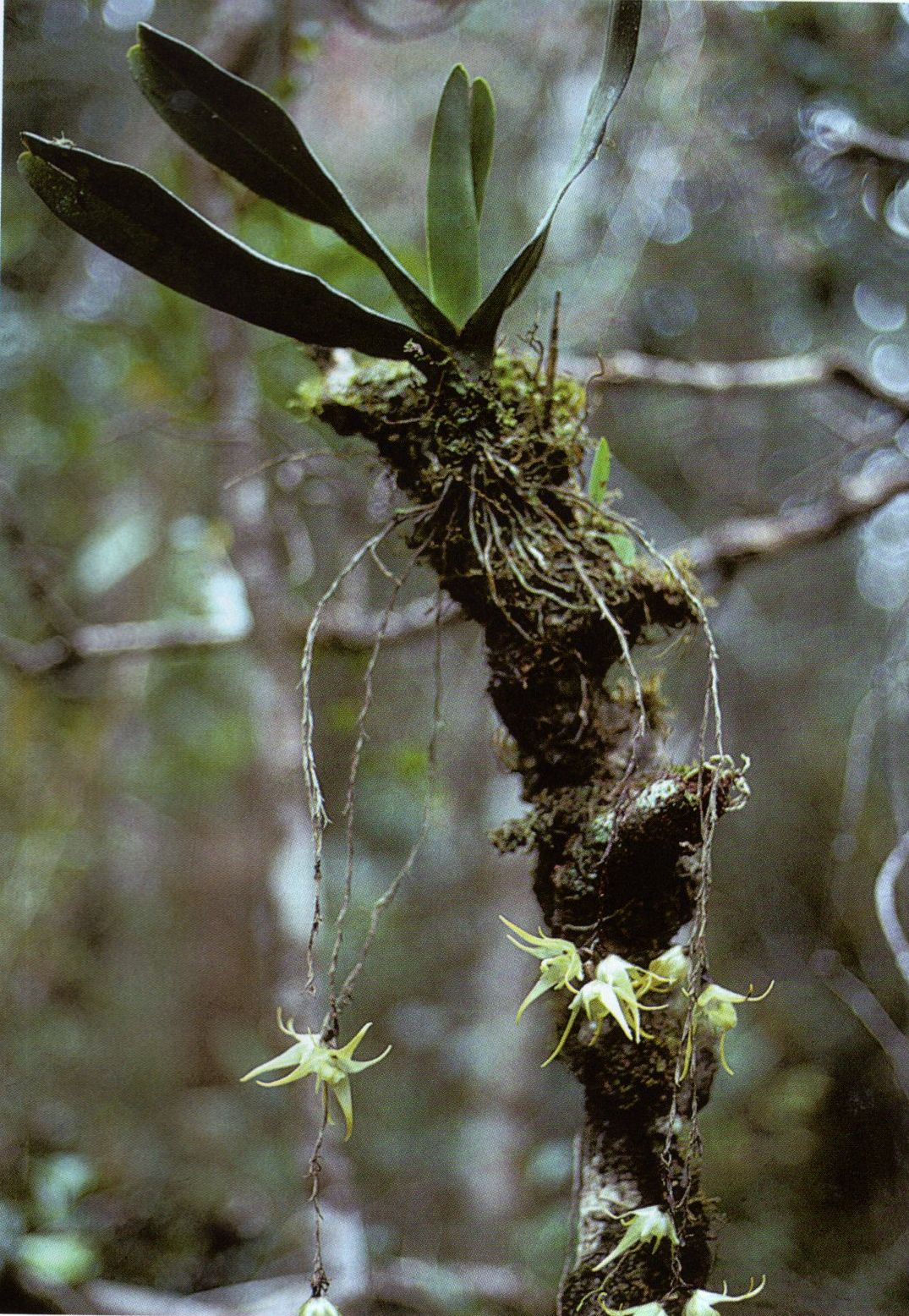 Found in central Madagascar in humid, mossy evergreen forests at elevations of 1250 to 1400 meters as a miniature to small sized, cool growing epiphyte without a stem carrying 4, linear-oblong, leathery, unequally bilobed apically, rouned lobes, narrowing at the base leaves that blooms in the late summer and early fall on 1 to 5, pendent, slender, peduncle many noded, completely enveloped by ovewrlapping sheaths, 6 to 14" [15 to 35 cm] long, 1 to 3 flowered inflorescence