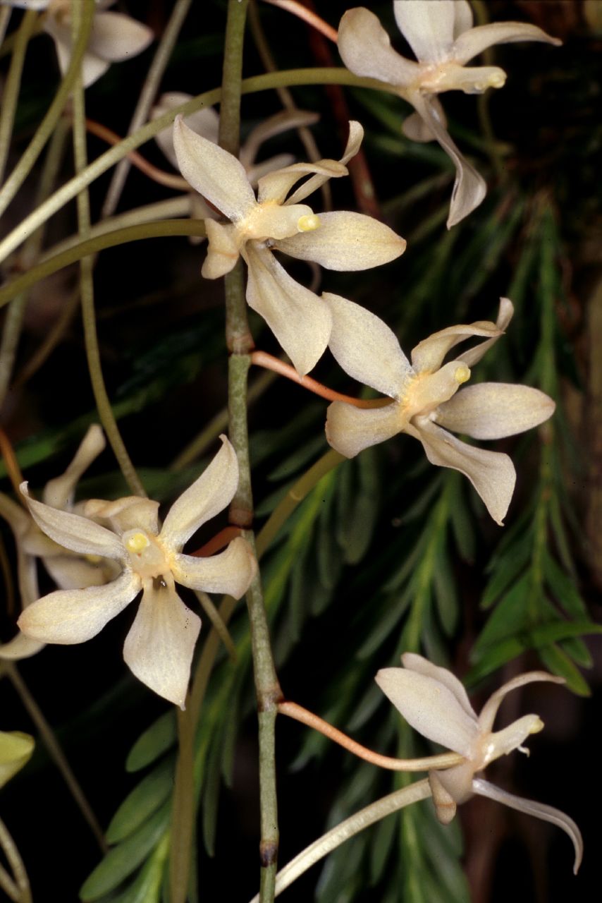 Found in the Comoros Islands and Madagascar in humid forests on branches at elevations of sea level to 600 meters as a miniature sized, hot growing epiphyte with an arcing to pendant, woody stem carrying 2 to 6, 2 ranked, elliptic, oblong to obovate, unequally bilobed apically, light to greyish green, smooth, glossy, margins entire leaves that blooms winter and early spring on an axillary to under the leaves, 6 to 12" [15 to 30 cm] long, 10 to 22 flowered inflorescence carrying jasmine scented flowers.