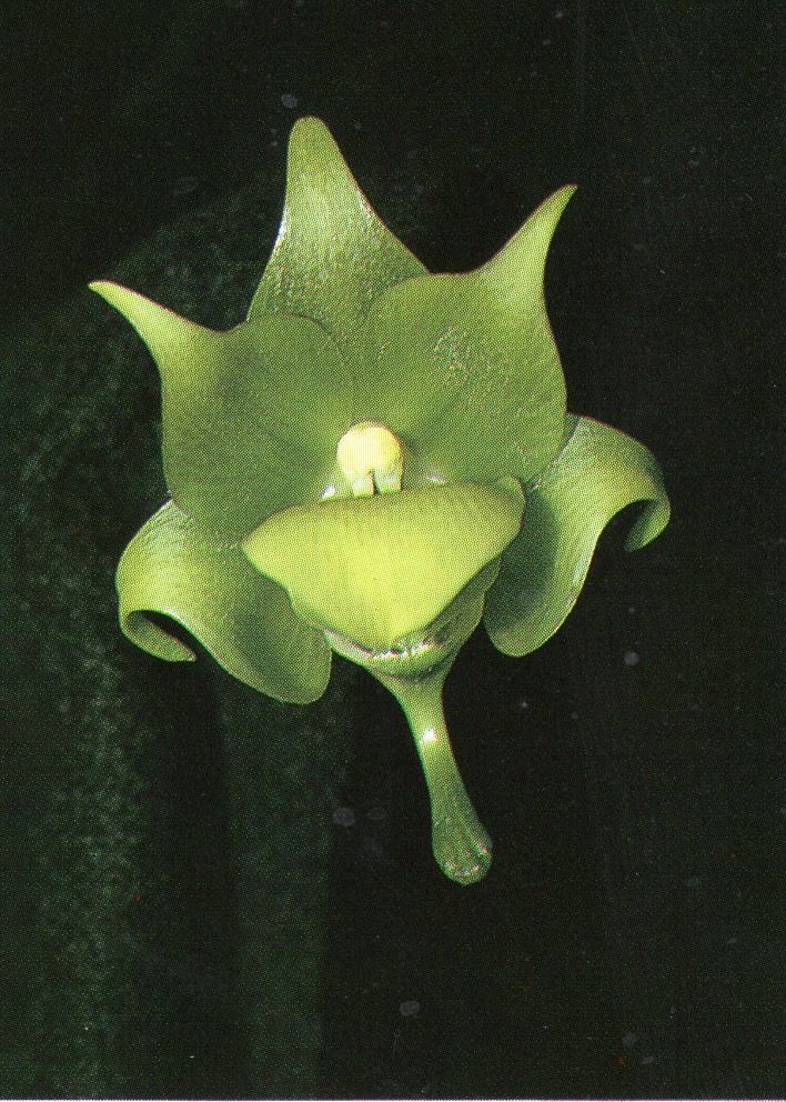 Found in the east northeastern Madagascar in evergreen forests in mosses and lichens at elevations around 1000 meters as a small sized, warm to cool growing epiphyte with a short stem carrying 9 to 10, thick, rather leathery, stiff dark green, oblong-linear, strongly equally to unequally, obtusely bilobed apically, conspicuously ribbed leaves that blooms in the spring on a pendent, slender, peduncle thread-like, dark green, 20 to 28" [50 to 70 cm] long, often 3 to 4 branched, branches to 16" [40 cm] long, internodes longer than the dark brown sheaths, successively 1 to 5 flowered inflorescence.
