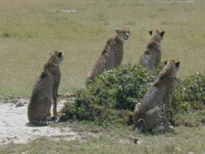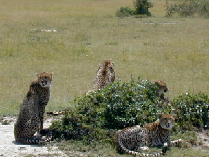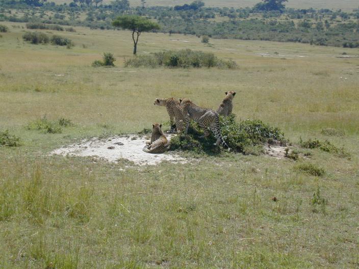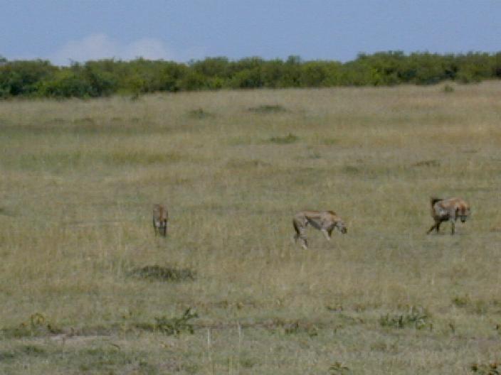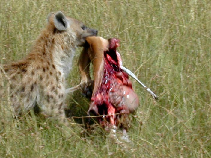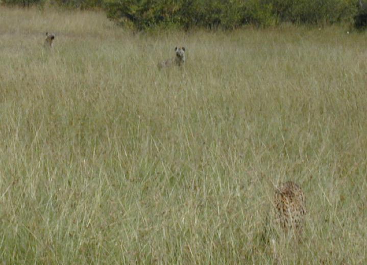 The cheetah is the fastest land animal on the planet and we were lucky enough to meet up with this cheetah family. The mother is the cat to the left and the other three are her babies. They are probably less than a year old. They are watching a group of Thompson Gazelles that are about 250 yards away. After a bit the cubs lose interest, they have short attention spans just like my children, but if you notice the mother is still waiting on edge for that moment to explode. I think that they just became aware that we are watching. Hey look mom is onto something! In a split second, the mother is off, speeding like a bullet. She comes close to her target and wham, cat and gazelle go rolling head over heels. When the dust settles, mom has the gazelle in her mouth and is strangling it. The moment a kill happens on the savannah, the whole world pays attention. Within seconds there are vultures circling in the sky. Jackals appear out of nowhere and excitedly run about. Hyenas start to melt out of the grass and look for weakness in the cheetahs resolve. Even a troop of baboons shows up to see if there is something in it for them. After a few minutes the mother carries the carcass to be sure that it is dead before releasing it from her jaws. They settle down to have dinner. The mother has gotten up to go fend off an encroaching hyena, but the 3 cubs are eating away. Hey mom do you have a napkin? The mother has been fending off one hungry hyena but now here comes two. Hey guys! Make room for me. UhOh Mom! now there are three hyenas. The mother knowing that she is outnumbered steals back to the carcass and her babies in the hope that she may be able to grab a bite. As soon as she moves back the Hyenas jump in and one of them steals the carcass. The cheetah mother for all her work has not gotten a bite to eat, but she has fended for her children and they will survive. She and her brood shrink off in search of another animal to kill. The Hyena went running off towards a small copse of trees. As soon as the hyena got close a large female lion jumped out and swatted the hyena and took the remainder of the carcass for itself.