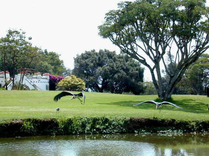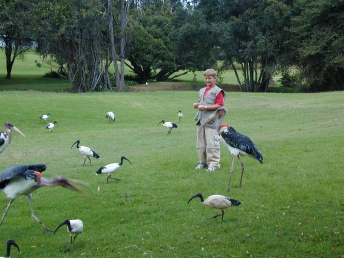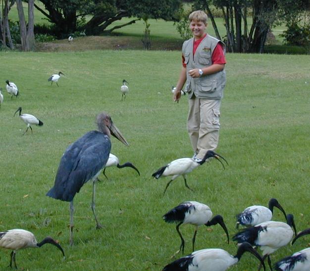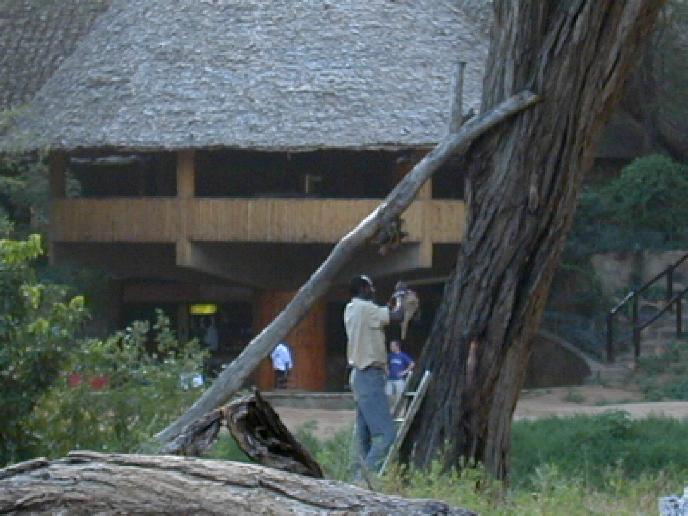 The next day we were off to Samburu national park an 8 hour drive, twoo 4 hour legs and an hour for lunch at the Mount Kenya Safari Club. My son had a good time feeding the Maribou Storks and the Sacred Ibis. Do you think Andres liked feeding them?? We also saw an African Spoonbill which sure is a different color than where I come from, ours are pink. This club was owned by William Holden the actor and he liked Africa's beauty. Before we left the Storks gave us a flyby show.