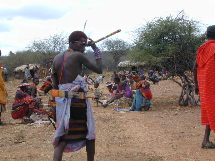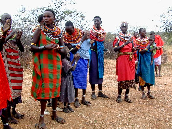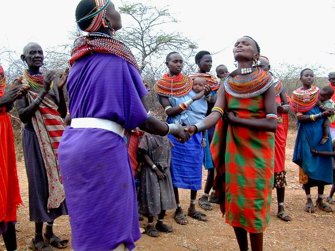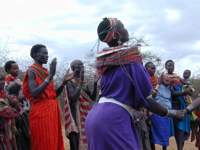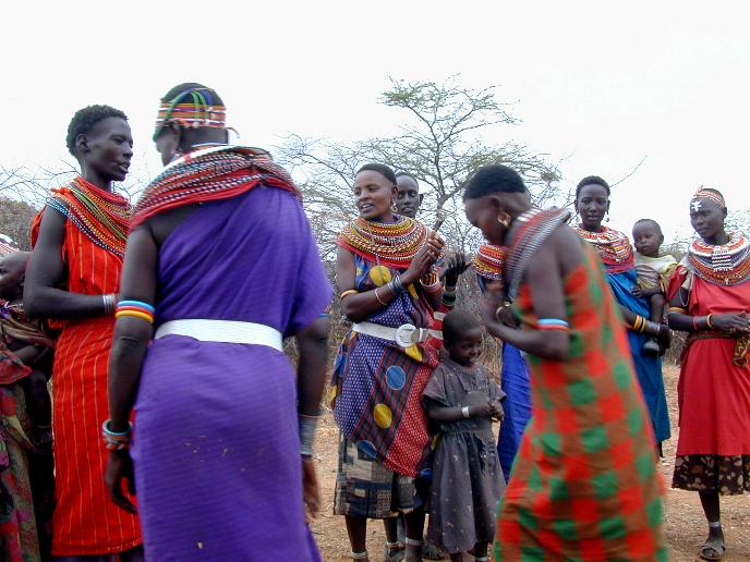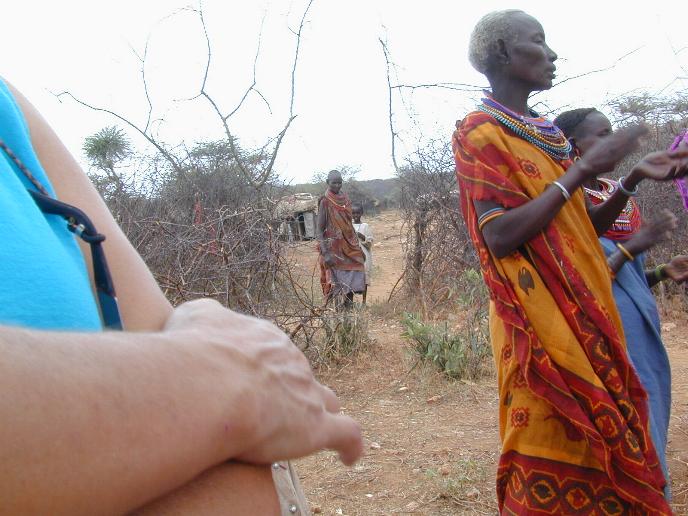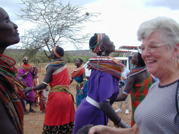 The Samburu have many dances and this is one that the Samburu women do to greet women from another can unit of the tribe. Now my mother gets down with the locals. In this picture, the girl to the right has a mother-of-pearl bird on her forehead, which is a fertility sign shows that she is looking to be married. This dance had a lot of "booty Shaking" it would be called here, you can see that dance and rhythyms have been adopted from Africa to the "modern west".