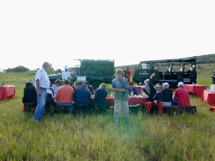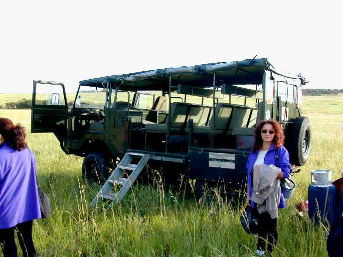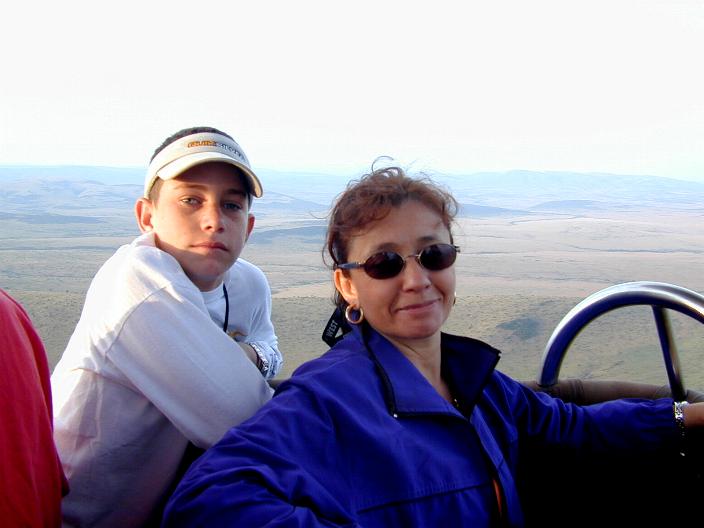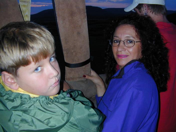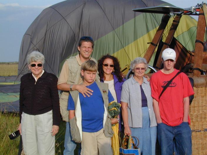 The next day we arrive in the Kenyan National Park, Masa Mara, home of the Masai. The park can be desolate yet inviting. After a short night's rest we were up, up and away in a hot air balloon for a sunrise trip. Predawn and we are geting the balloon filled with hot air. and it begins to rise. The gas jets create the hot air that makes this craft lighter than air. The balloon rises so gently that it is hard to realize that you are flying high. My wife Carmenza and Andres are not sure that they like it yet. My son Jason the Stoic. The sunrise from above. Vilma and the stoic on high. The family after the big ride, did the little one have a good time? The military vehicle is how they found us and how we will return from the balloon ride. After the flight we had breakfast on the savannah.