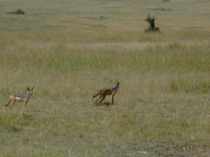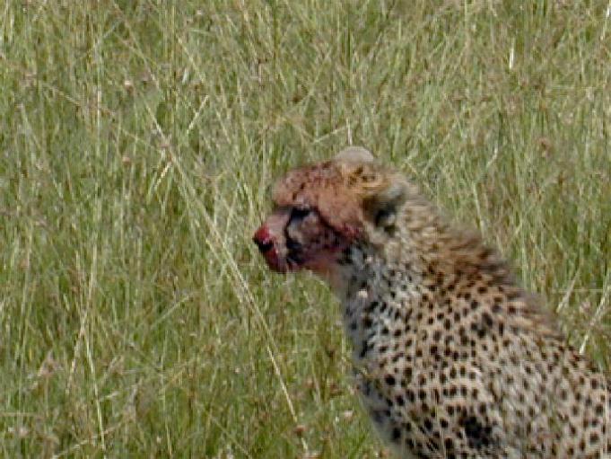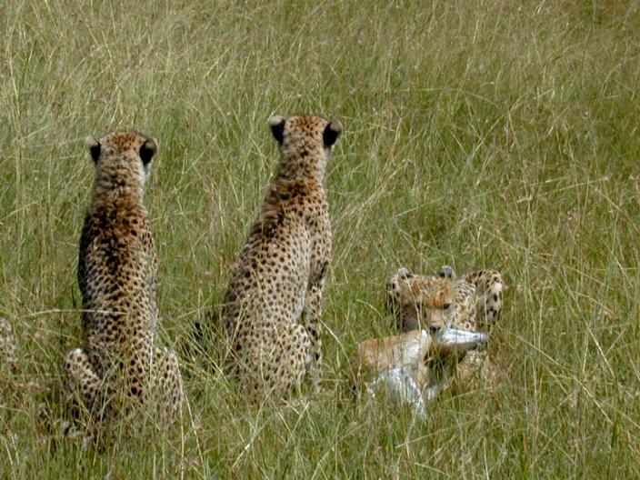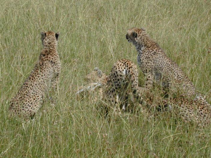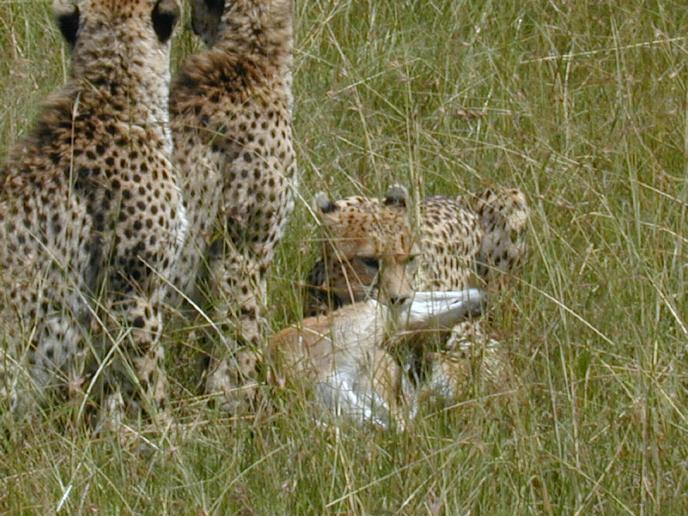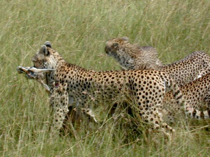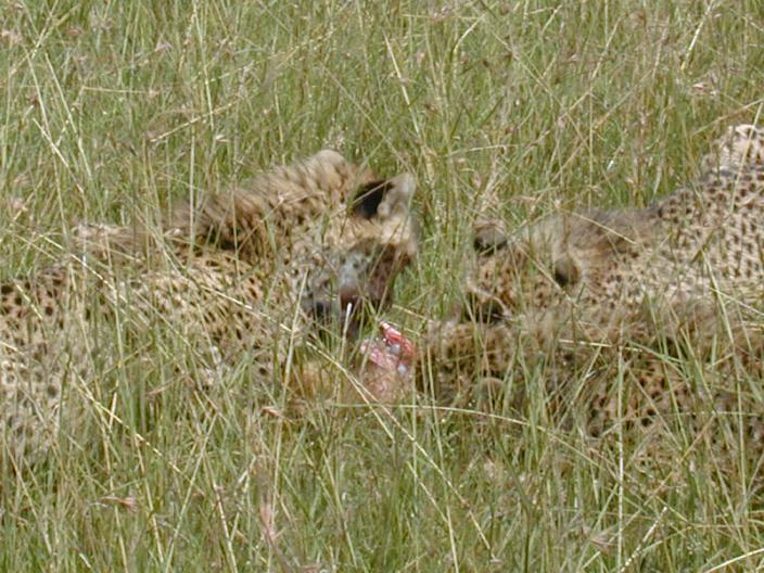 This was an incredible scene that took 15 minutes total from Cheetah strangling the gazelle, to the lion finishing off the last scraps of the carcass. The gazelle probably weighed 80 pounds and it was gone, just like that. It was intense and hard to tear ones eyes away. Many of the photos are of poor quality but only because of the rapidity of action that occured 15 feet in front of my eyes. Base emotions arose among the spectators of this most basic need for animals to survive. As the "evil" Jackal grabbed the carcass from the "hero" cheetah a man in another vehicle let loose with "what an asshole", and everyone laughed and agreed. Our guide said that viewing a kill, happened for visitors occasionally here, but he said that we had seen a once in a life time spectacle with the addition of the 3 cheetah cubs [more on this], the jackals carrying away the carcass, the lioness jumping the hyena and all of it happening within 15 feet of us. Anyway forgive the quality of the photos, I only put them up because it was a unique event. The cheetah normally only raises one cub a year, occasionally 2 if the mother is a good hunter, but 3 is almost unheard of and this particular female has been observed in previous seasons with 3 as well, so she is a walking population explosion for the cheetah of Masa Mara.