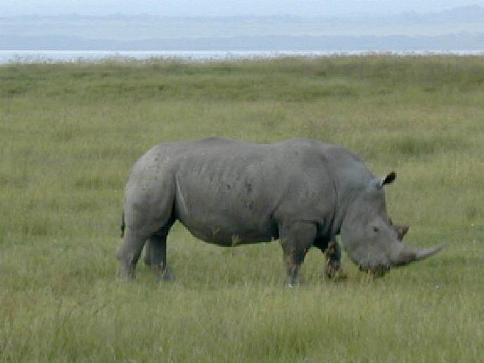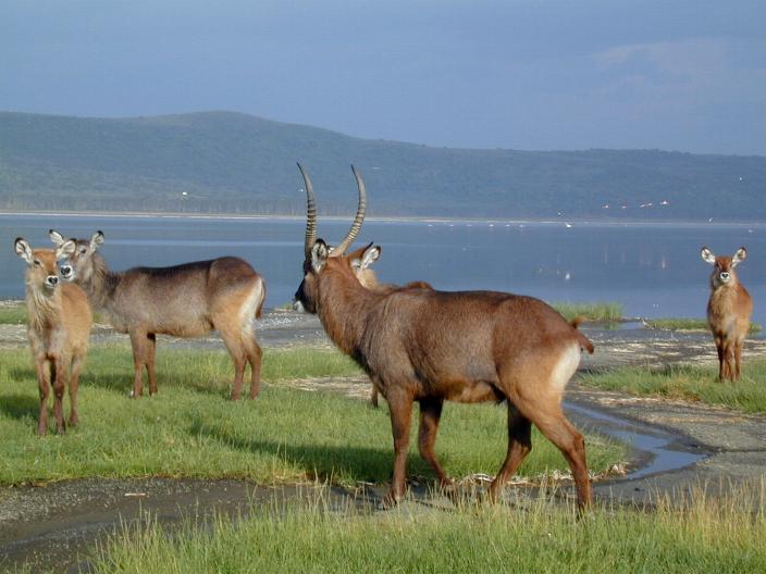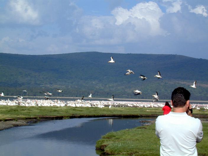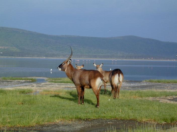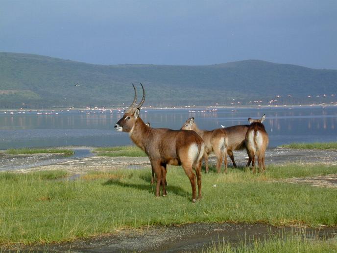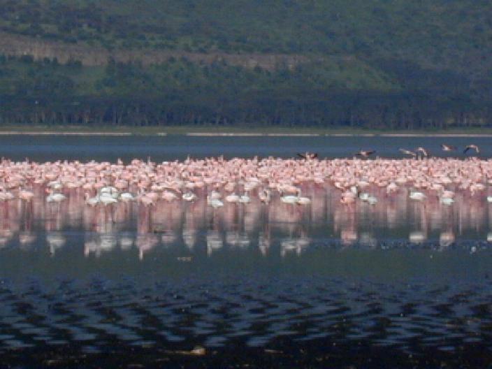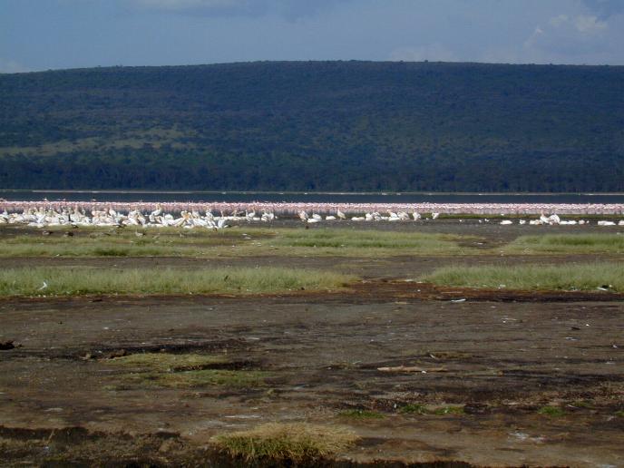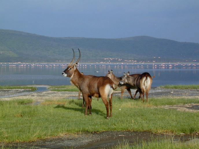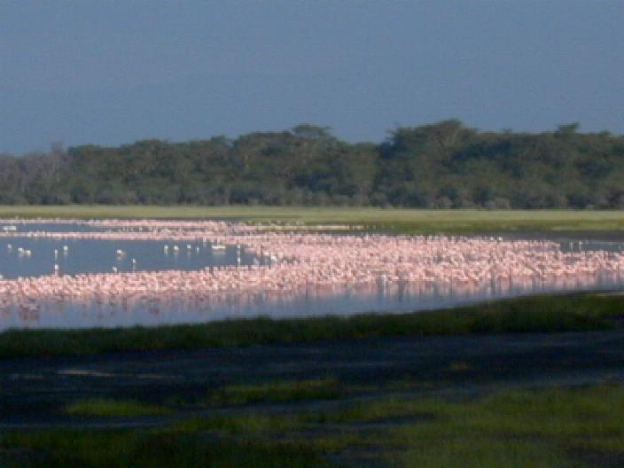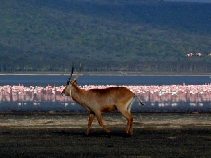 We finally arrived at our new destination, Lake Nakuru, a Kenyan national park that is bordered by the city of Nakuru. Here is a white rhino that is close to the edge of the park, note the power line. This is the only park that has an electrified fence totally surrounding it to keep the animals and the town apart. The lake is entirely surrounded by both lesser and greater Flamingos and Pelicans in the shallows along the edge of the lake. A little later we saw a male waterbuck. Here is a shot of how many flamingos there are as well as a waterbuck. It is obvious that the artist Christo that was obssessed with surrounding things [Florida Keys, Western Mountains etc.] with pink had visited this lake. Here is both male and female waterbucks. Here is another view. And another view. One last final view. After a bit a Cape Buffalo came for a drink.