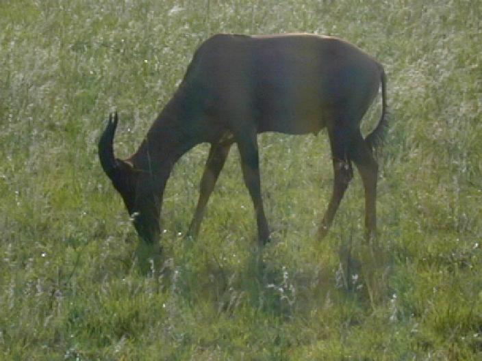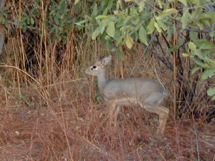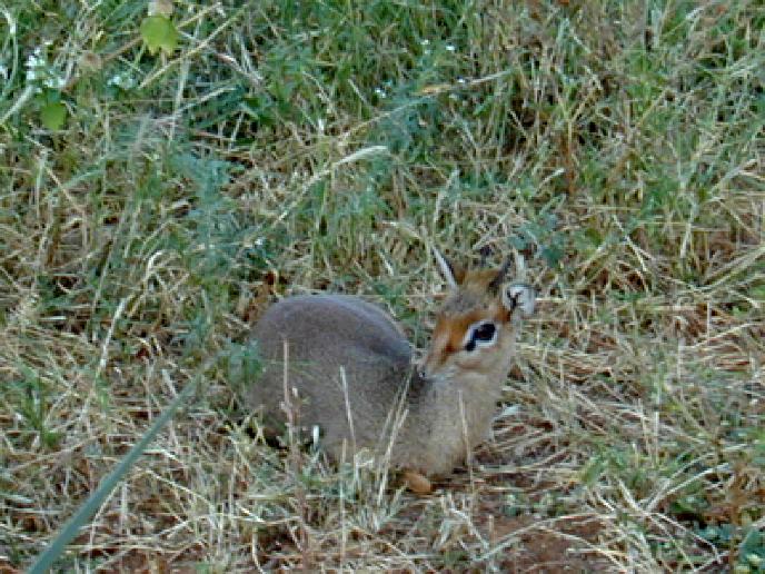 One thing that became clear the next morning at 5 am was that this was not going to be a relaxing vacation for us. The motto was get up and go and so we did. Our hotel was just outside the boundaries of the park and was a compound that was surrounded by electric fence to keep the animals out. We all loaded up the vehicle after sucking down a coffee to get out the cobwebs and were off on another days adventure. We would be back to the hotel in an hour to eat breakfast but they get you out early to see the night and day animals that both are out and about. Our first sighting was a dik-dik, one of the smallest of the antelope. The dik-dik stands about 10" tall. The black spot around the eye is a musk gland which can secrete a liquid. You can see them rubbing their faces against trees to mark their territory with their musk.