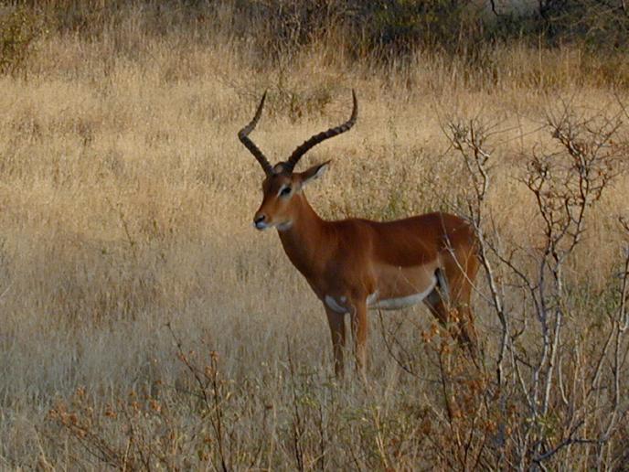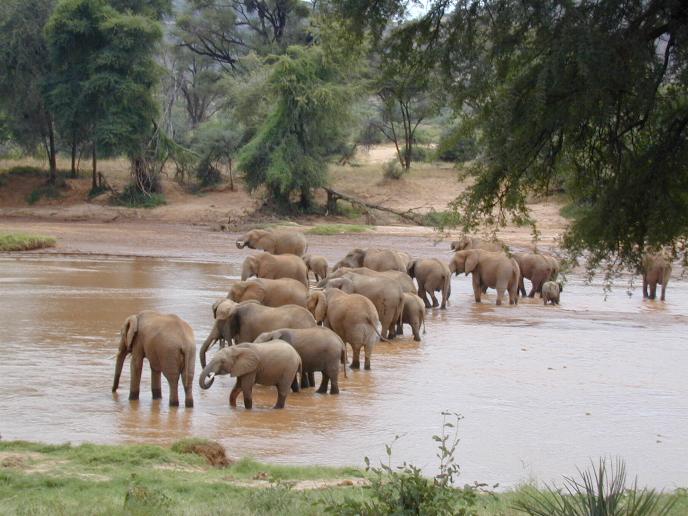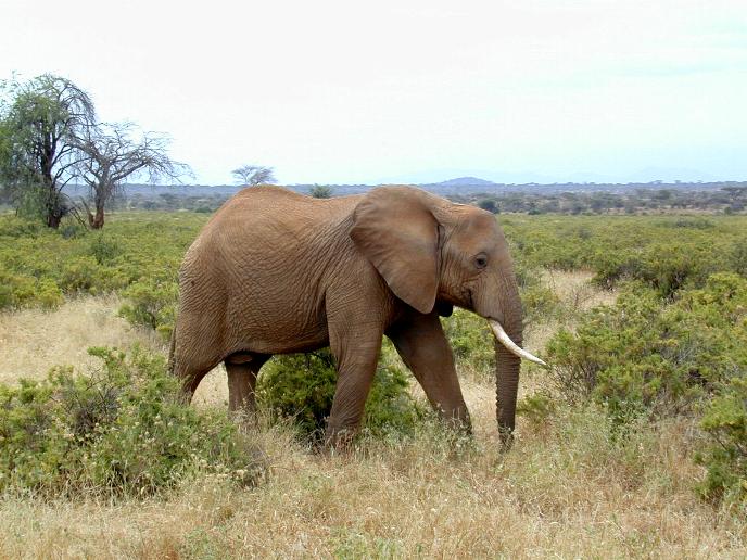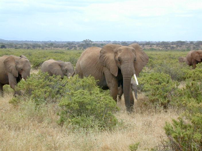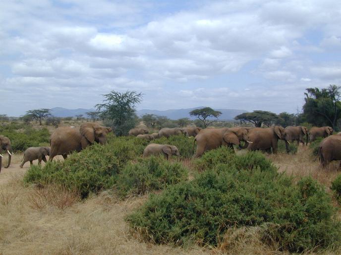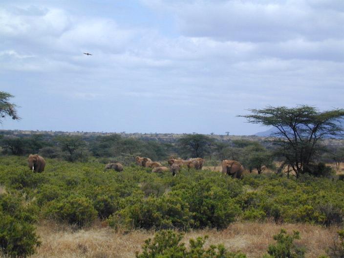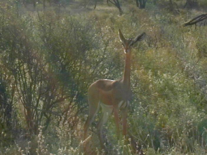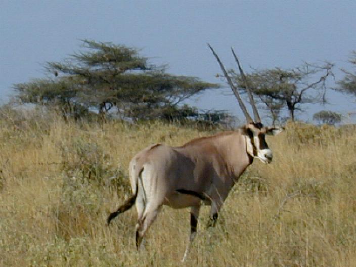 Some species of antelope are not as common as others and the oryx is rarer than others because previously [hunting has been banned in Kenya for thirty years] it was hunted to near extinction for it's interesing antlers. Another rare antelope is the Gerenuk. It can get on it's rear legs and pick at higher branches unlike other antelope.One species that their are plenty of is the impala which here is a dominant male and some of his female harem. Elephants are common in this park and they are always strolling by. It is amazing that they are totally silent as they walk, the earth does not shake, there is no thudding sound of the huge feet as they plod along. This old bull is missing one of his tusks. The babies always move in the middle of the herd and it is not unusual to see a large one step on a baby. LAte in the afternoon they make their way to the river for a drink,, swim and bath.