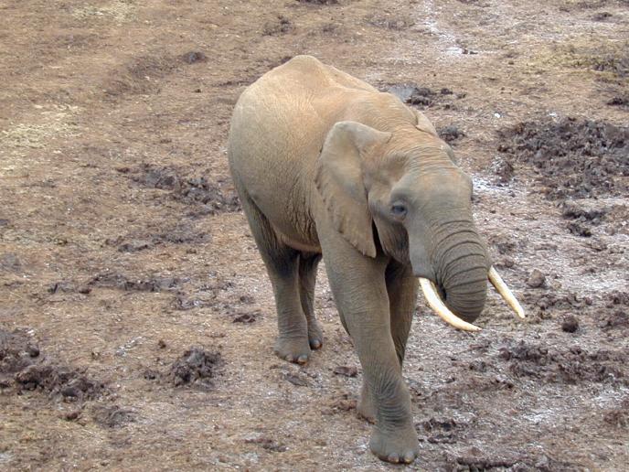 We started off toward our next destination which is The Ark, a hotel high in the mountains next to a waterhole. The balcony of the rooms has a great view of the surrounding swale where the water collects and as you can see by all the trails, the animals come in often to drink. Soon after, an elephant came lumbering in. Our first big game! Less than 20' from where we were situated was this mammoth being. It came right by us and went over for a drink and a lick at the salt deposits that build up in this particular spot. You can see in the photo the white patches on the ground, it is salt and the elephant is snarfling it up with his prehensil nose.