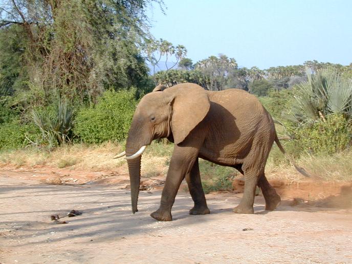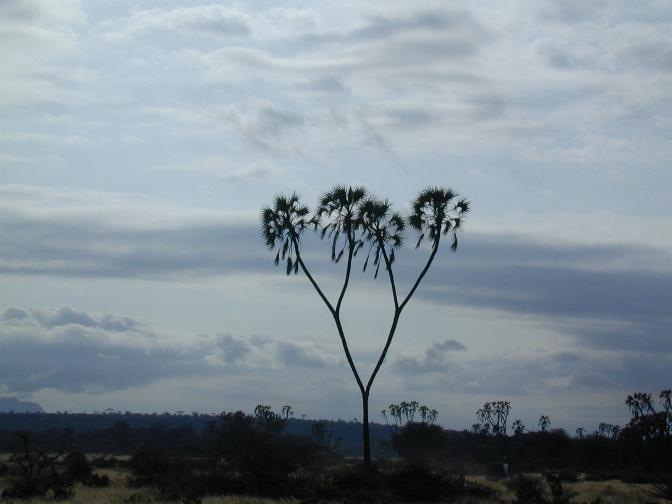 The vegetation in this area is scrubby and spiny. Almost all the trees have spines of some sort. That is because many animals here eat tree leaves as thatis what there is an abundance of. As you aproach water [stream, river, or small waterhole] the trees change and palms become more common. This palm endemic to Kenya has an interesting way of propagation. It must be ingested and passed through the stomach of an elephant before it will germinate. I love the branching palm trunks, something we don't see in Florida.
