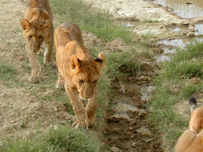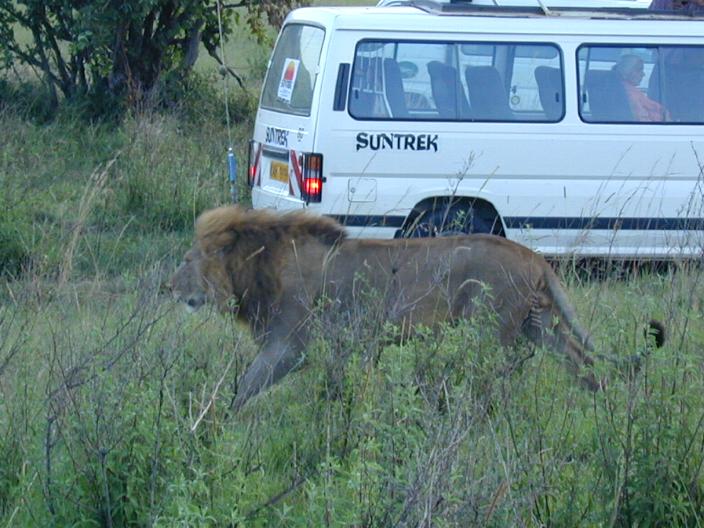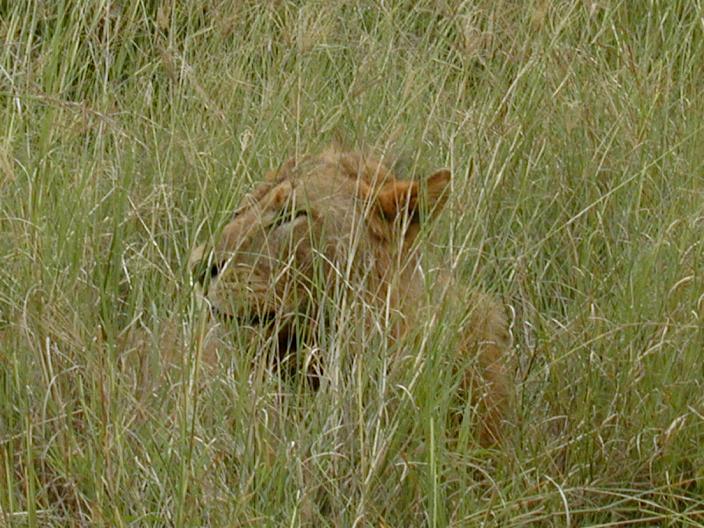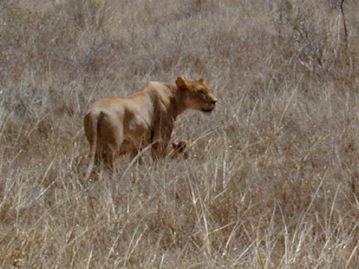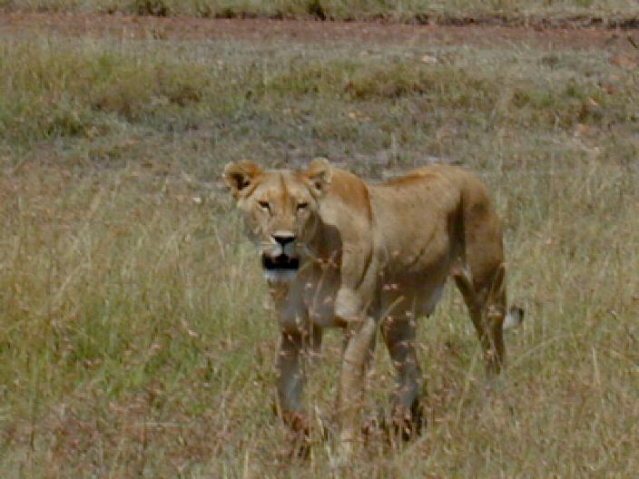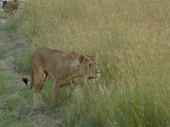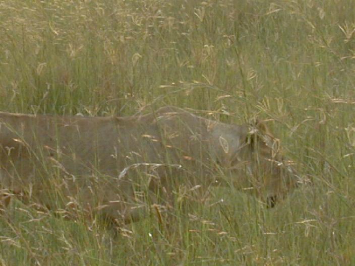 Leaving the lakes edge we encountered our first Masai Giraffe. Moving on we spotted another White Rhino. Driving a bit further we see our first lions a mother with her three cubs. They kept on getting closer. And closer. We are in an open topped van which the lion could jump into if it wished and seeing this wild beast of prey so close is unnerving. Lions depend on camoflauge to hunt. their tan fur blends in quickly in the tall grass of the savannah. It is amazing that something so big just dissappears in just a little grass. Look something got his attention. This photo shows just how close we were to the King Of the Jungle. This is a photo of a young male lion. This is a photo of the queen of the jungle. Here come the Kids. How close can they get?