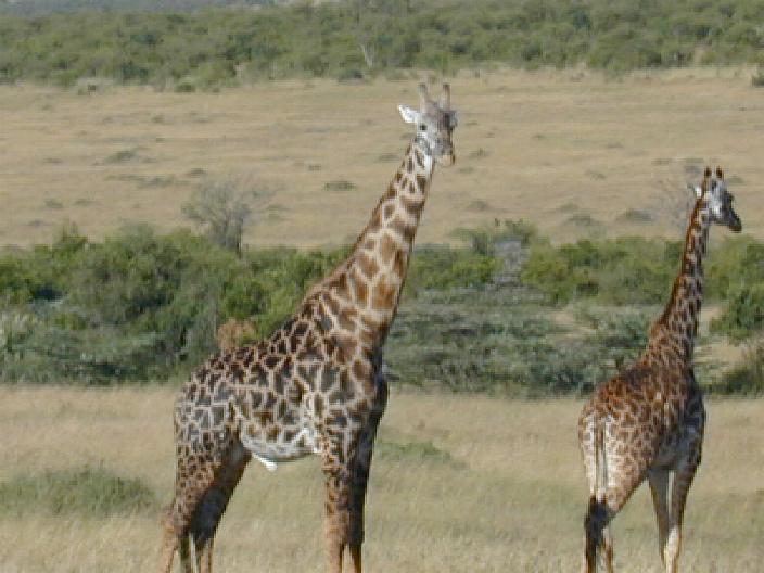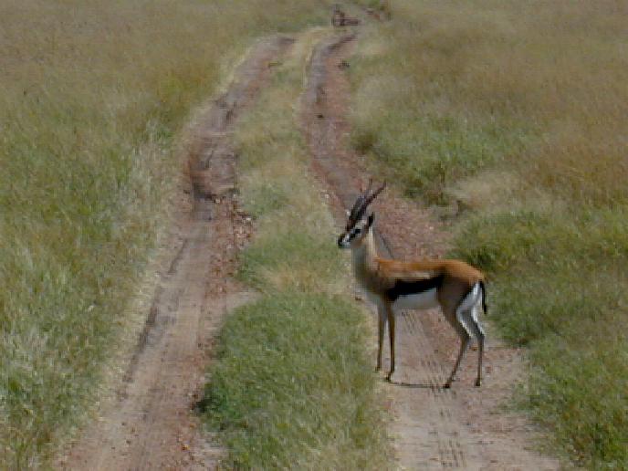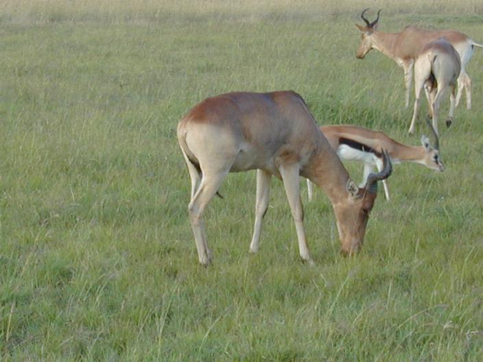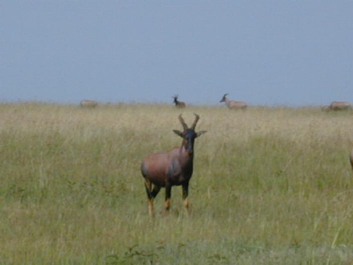 Here is a common small antelope, the Thompson's Gazelle. Here is a close up of a male Thompson's Gazelle Here are a few female Thompson's Gazelles Another common range animal in Masa Mara is the Topi. A close up view. Another Male Topi. The hartebeast is another antelope of the savannah of Masa Mara. The Masai Giraffe is seen here in abundance. Hey there's Big Bird, except he is not yellow. Meet the male Ostrich who is in full breeding colors. Notice the pink legs, he is ready to strut his stuff for a female. You must be careful around this giant bird as they can deliver a killing kick with their legs.
