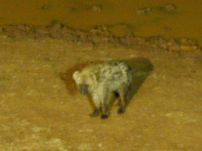 Moments later a family of Crowned Cranes came in. Notice the brown chicks in the bottom of the photo. Later that night we watched the animals come in until about 3 in the morning. Here is a hyena, a bad photo but so are they. Just before we crashed for the night this genet, a small, night cat came to our balcony. The photo was taken without a flash and just relied on the spotlight that was outside.