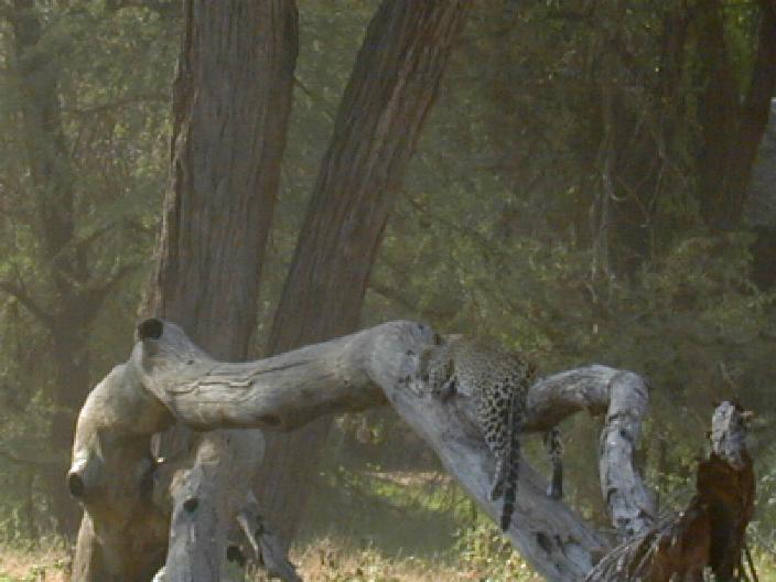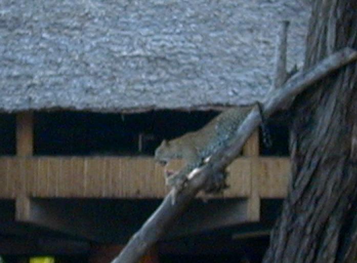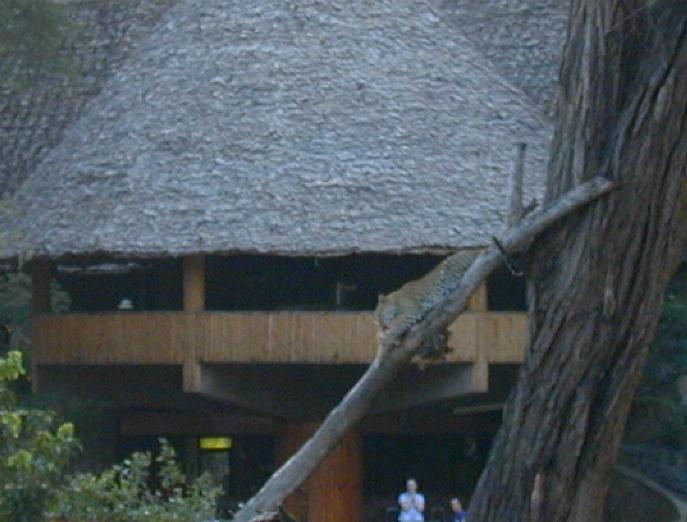 Late in the afternoon we entered the Samburu National Park and saw our first male impala. The scenes that appear as you drive around this immense park are astounding and often seems to be fantasy. Our first predator experience unfolded soon thereafter. We stumbled upon an idylic scene. A leopard was asleep on a log. Hard to imagine that this creature could kill you in a moment and gives new meaning to the phrase,"just another bump on a log". Leopards hunt at night, hence the relaxed situation that we encountered. They do try once in a while to hunt in the day but just don't have the speed that it takes when the prey can see you. Our hotel decided to bring a leopard in to feed for us so they tied a leg to a tree and we waited. The leopard came in and ate the leg quickly