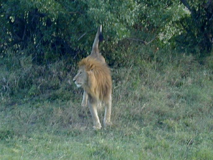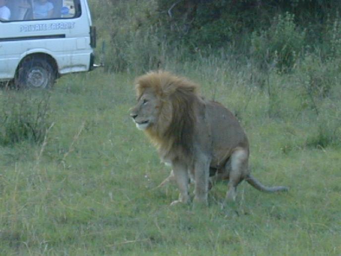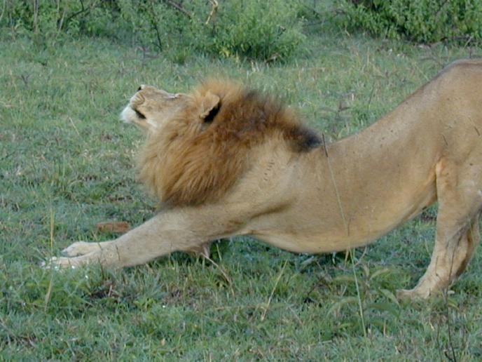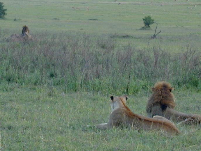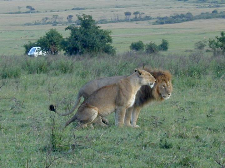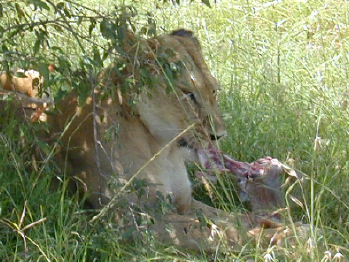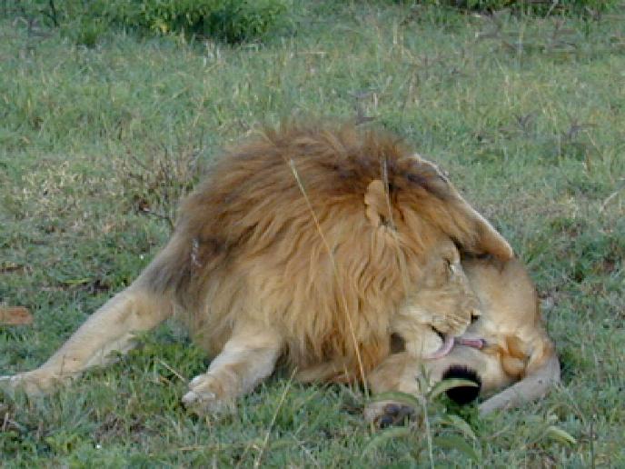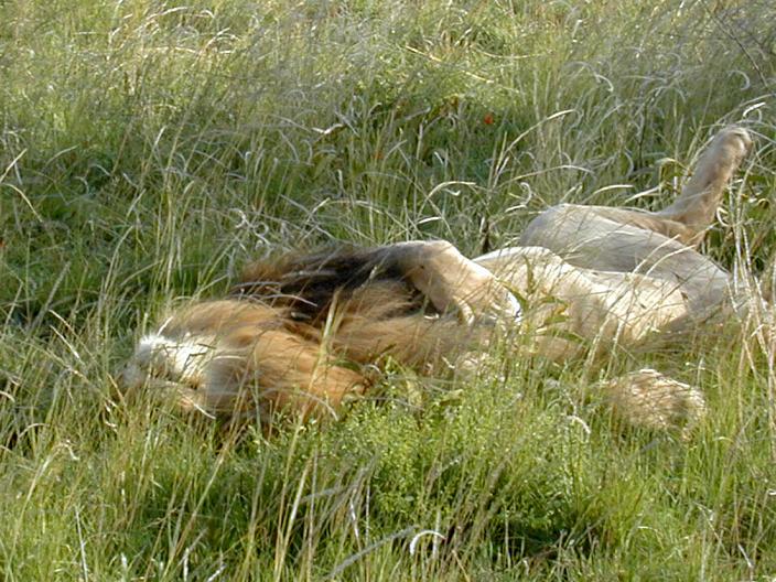 A female lion on the savannah. Lions are very good at sleeping. This sleeping male let us drive our vehicle right up to within 2 feet of his head and never budged. Asleep until you open a door. I know how I feel before coffee. Ok, I'm up now. Haven't I seen you at the New York Library? . Male lions steal their food from the females who do the hunting. I think it is time to back up.. I thought I was awake. Where is that cup of coffee? OOOH I got an itch. Do Not look if you are under 21 or sexual parts make you squeamish. I want My Mommy!! Oh that's the ticket! The male sauntered up to the female and they exchanged pleasantries. The male seems to be getting through and the female is responding Two minutes later she swipes him a big one with her claws and he leaves dejectedly, But not before leaving her a present. You won't see that on Animal Planet! As a parting shot he sprays the area. This pair of lovebirds are checking out the menu