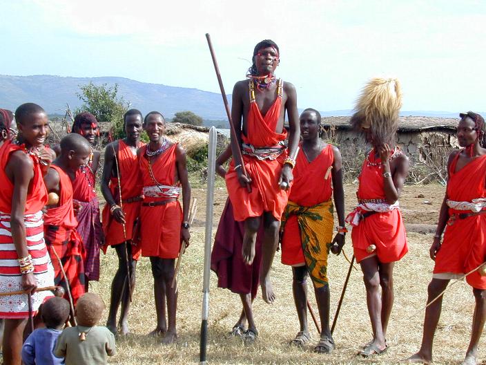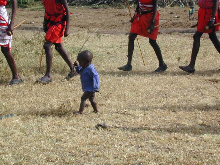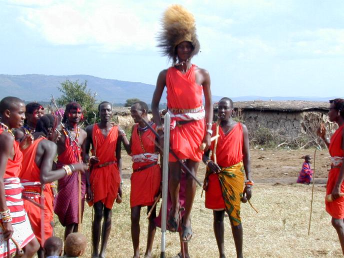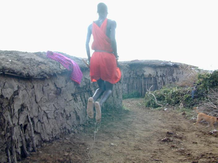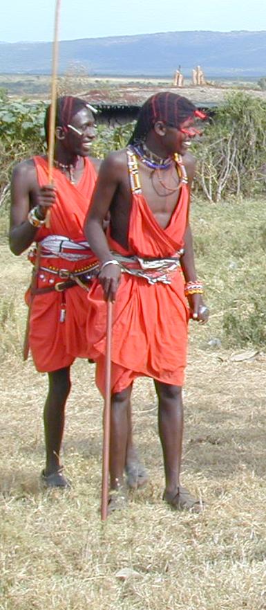 Masa Mara is a National Park but it also the home to the Masai, a nomadic tribe of cattle herders. The house that is behind them is a typical Masai house which is a temporary structure not much different than the Samburu, except that the Masai use more cow manure. Here it is used on the roof, the walls and most all the ground in the compound [inside the brush fence] is cowmanure. As my oldest son remarked, "Boy do they like Poop". The children were lined up for us to photograph. The masai women wear colorful patterns. The women sing us a song. The men do a traditional Dance. The Jumping Dance is a well known Masai dance. This warrior has a lion mane hat which he killed by hand at a manhood ceremony when he was 15. These two men have mud and henna worked into their braided hair . Often the men and boys can be seen in the bush wearing large wooden plugs in their ears. They do this to stretch the hole so it appears very wide open. Check out the guy on the right. Children love to imitate. Anthropologists would have a fit with this little Masai boy. Notice the brown bottle that he carries. The other little boy has many flies around his eyes. Each time the tribe lines up for photos the little boy puts the bottle to his face as if it was a camera and clicks a picture. This fellow is in the Masai space program