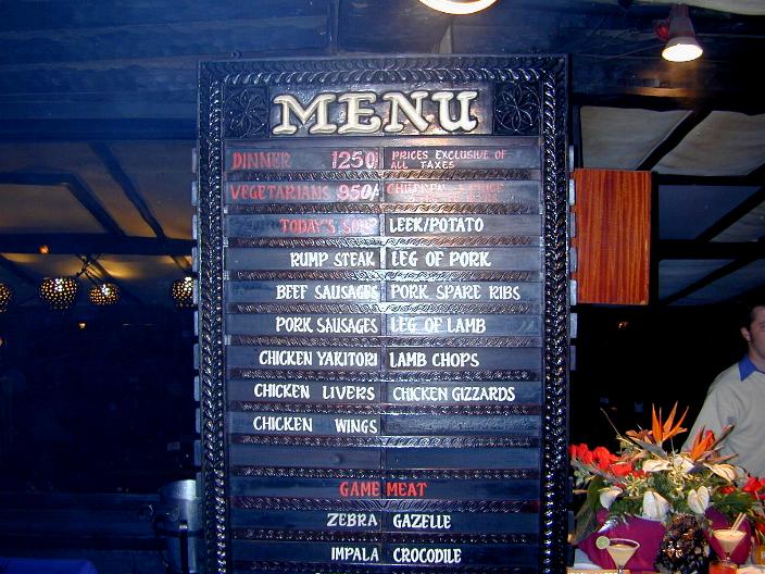Back in Nairobi we head out to our last meal with this tour group. The Carnivore is a famous restaraunt that serves game meat. What a menu. We chowed down on impala, zebra, crocodile, gazelle and ostrich.