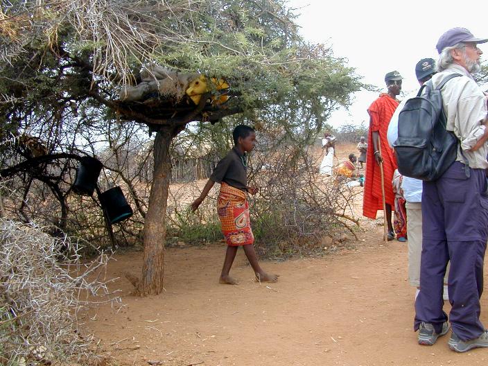 The Sausage Tree is used to produce the Masai beer. The Masai raise cattle but as an elder told me "you wouldn't eat a twenty dollar bill would you?, well neither will I". He was explaining away the fact that Masai and Samburu do not often eat meat. In fact the only meat they eat is if they got it in a raid on someone that they thought had stolen from them. The masai use their cattle as a renewable resource, so they eat milk and blood mixed together. They bleed their cattle with a spine at the neck and mix the fresh blood with milk. The masai and Samburu do not eat many vegetables either as they are nomadic and can't wait around for crops to ripen. They will eat fruits if they find them as well as some wild herbs. I was glad that we didn't stay around for dinner.